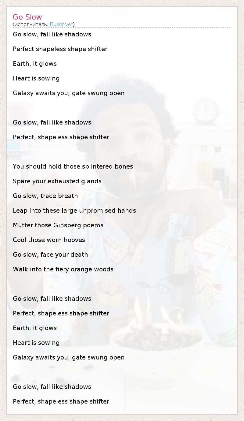Go slow, fall like shadows Perfect shapeless shape shifter Earth, it glows Heart is sowing Galaxy awaits you; gate swung open Go slow, fall like shadows Perfect, shapeless shape shifter You should hold those splintered bones Spare your exhausted glands Go slow, trace breath Leap into these large unpromised hands Mutter those Ginsberg poems Cool those worn hooves Go slow, face your death Walk into the fiery orange woods Go slow, fall like shadows Perfect, shapeless shape shifter Earth, it glows Heart is sowing Galaxy awaits you; gate swung open Go slow, fall like shadows Perfect, shapeless shape shifter