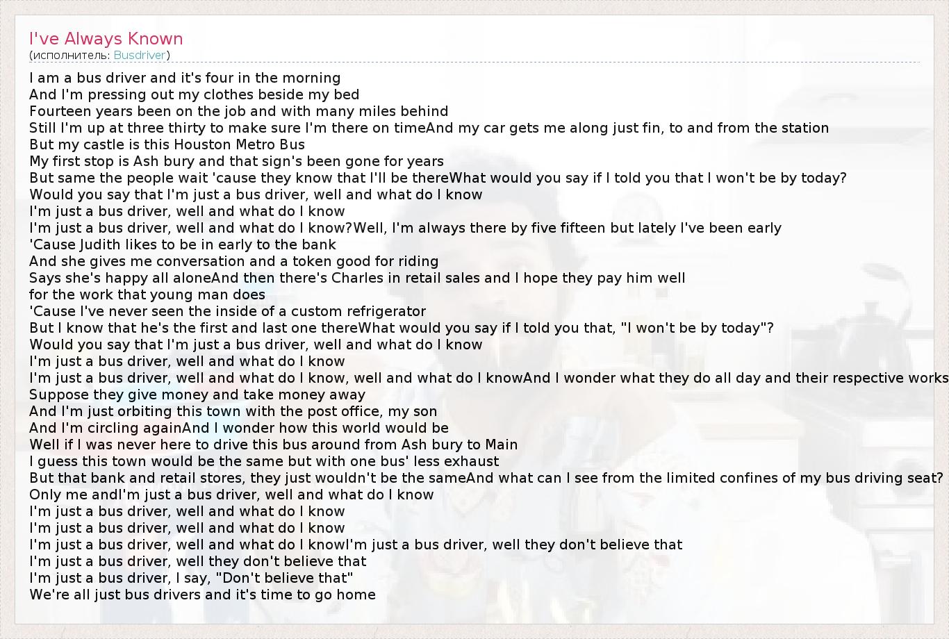 I am a bus driver and it's four in the morning And I'm pressing out my clothes beside my bed Fourteen years been on the job and with many miles behind Still I'm up at three thirty to make sure I'm there on timeAnd my car gets me along just fin, to and from the station But my castle is this Houston Metro Bus My first stop is Ash bury and that sign's been gone for years But same the people wait 'cause they know that I'll be thereWhat would you say if I told you that I won't be by today? Would you say that I'm just a bus driver, well and what do I know I'm just a bus driver, well and what do I know I'm just a bus driver, well and what do I know?Well, I'm always there by five fifteen but lately I've been early 'Cause Judith likes to be in early to the bank And she gives me conversation and a token good for riding Says she's happy all aloneAnd then there's Charles in retail sales and I hope they pay him well for the work that young man does 'Cause I've never seen the inside of a custom refrigerator But I know that he's the first and last one thereWhat would you say if I told you that, "I won't be by today"? Would you say that I'm just a bus driver, well and what do I know I'm just a bus driver, well and what do I know I'm just a bus driver, well and what do I know, well and what do I knowAnd I wonder what they do all day and their respective works Suppose they give money and take money away And I'm just orbiting this town with the post office, my son And I'm circling againAnd I wonder how this world would be Well if I was never here to drive this bus around from Ash bury to Main I guess this town would be the same but with one bus' less exhaust But that bank and retail stores, they just wouldn't be the sameAnd what can I see from the limited confines of my bus driving seat? Only me andI'm just a bus driver, well and what do I know I'm just a bus driver, well and what do I know I'm just a bus driver, well and what do I know I'm just a bus driver, well and what do I knowI'm just a bus driver, well they don't believe that I'm just a bus driver, well they don't believe that I'm just a bus driver, I say, "Don't believe that" We're all just bus drivers and it's time to go home