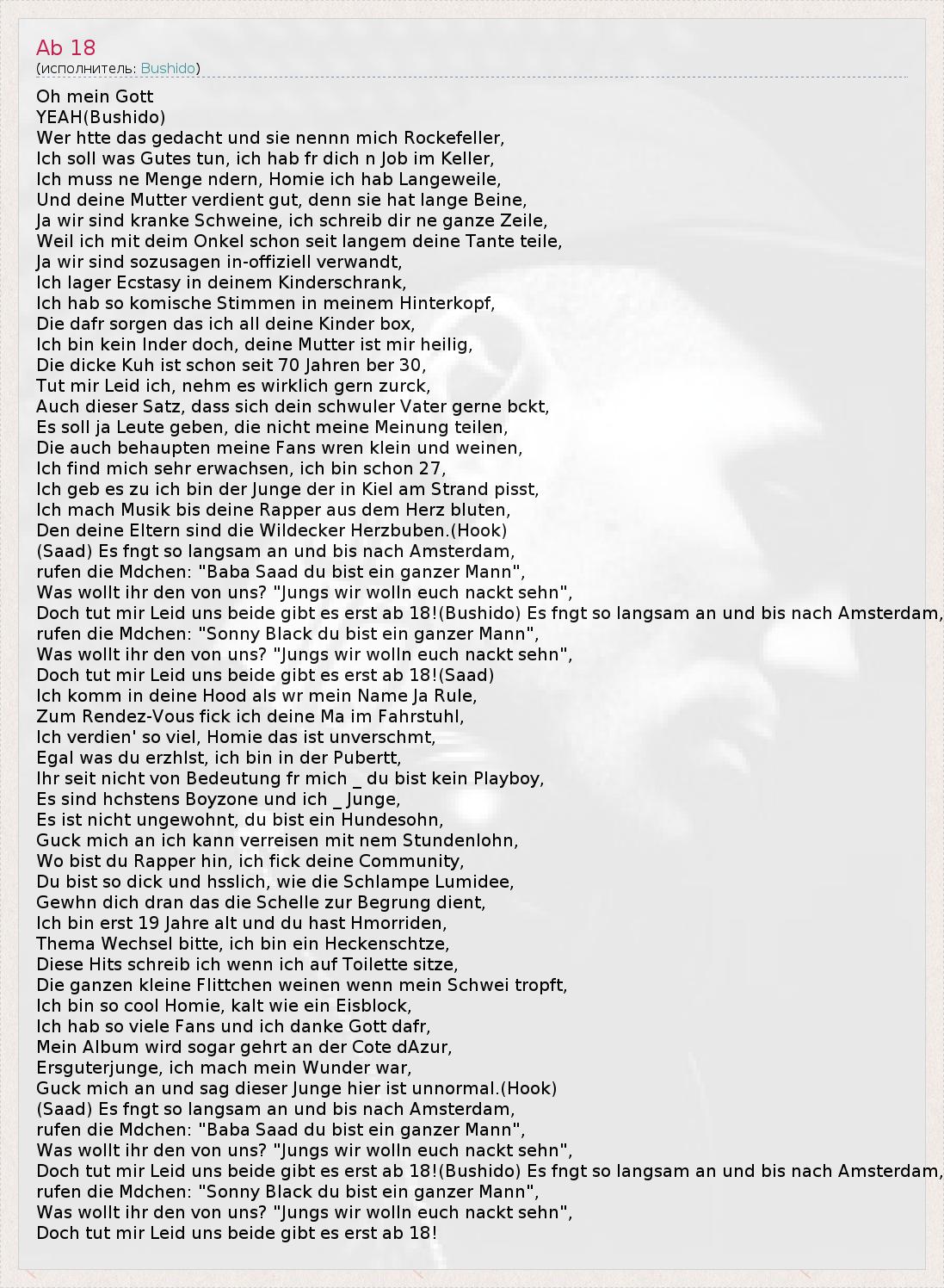 Oh mein Gott YEAH(Bushido) Wer htte das gedacht und sie nennn mich Rockefeller, Ich soll was Gutes tun, ich hab fr dich n Job im Keller, Ich muss ne Menge ndern, Homie ich hab Langeweile, Und deine Mutter verdient gut, denn sie hat lange Beine, Ja wir sind kranke Schweine, ich schreib dir ne ganze Zeile, Weil ich mit deim Onkel schon seit langem deine Tante teile, Ja wir sind sozusagen in-offiziell verwandt, Ich lager Ecstasy in deinem Kinderschrank, Ich hab so komische Stimmen in meinem Hinterkopf, Die dafr sorgen das ich all deine Kinder box, Ich bin kein Inder doch, deine Mutter ist mir heilig, Die dicke Kuh ist schon seit 70 Jahren ber 30, Tut mir Leid ich, nehm es wirklich gern zurck, Auch dieser Satz, dass sich dein schwuler Vater gerne bckt, Es soll ja Leute geben, die nicht meine Meinung teilen, Die auch behaupten meine Fans wren klein und weinen, Ich find mich sehr erwachsen, ich bin schon 27, Ich geb es zu ich bin der Junge der in Kiel am Strand pisst, Ich mach Musik bis deine Rapper aus dem Herz bluten, Den deine Eltern sind die Wildecker Herzbuben.(Hook) (Saad) Es fngt so langsam an und bis nach Amsterdam, rufen die Mdchen: "Baba Saad du bist ein ganzer Mann", Was wollt ihr den von uns? "Jungs wir wolln euch nackt sehn", Doch tut mir Leid uns beide gibt es erst ab 18!(Bushido) Es fngt so langsam an und bis nach Amsterdam, rufen die Mdchen: "Sonny Black du bist ein ganzer Mann", Was wollt ihr den von uns? "Jungs wir wolln euch nackt sehn", Doch tut mir Leid uns beide gibt es erst ab 18!(Saad) Ich komm in deine Hood als wr mein Name Ja Rule, Zum Rendez-Vous fick ich deine Ma im Fahrstuhl, Ich verdien' so viel, Homie das ist unverschmt, Egal was du erzhlst, ich bin in der Pubertt, Ihr seit nicht von Bedeutung fr mich _ du bist kein Playboy, Es sind hchstens Boyzone und ich _ Junge, Es ist nicht ungewohnt, du bist ein Hundesohn, Guck mich an ich kann verreisen mit nem Stundenlohn, Wo bist du Rapper hin, ich fick deine Community, Du bist so dick und hsslich, wie die Schlampe Lumidee, Gewhn dich dran das die Schelle zur Begrung dient, Ich bin erst 19 Jahre alt und du hast Hmorriden, Thema Wechsel bitte, ich bin ein Heckenschtze, Diese Hits schreib ich wenn ich auf Toilette sitze, Die ganzen kleine Flittchen weinen wenn mein Schwei tropft, Ich bin so cool Homie, kalt wie ein Eisblock, Ich hab so viele Fans und ich danke Gott dafr, Mein Album wird sogar gehrt an der Cote dAzur, Ersguterjunge, ich mach mein Wunder war, Guck mich an und sag dieser Junge hier ist unnormal.(Hook) (Saad) Es fngt so langsam an und bis nach Amsterdam, rufen die Mdchen: "Baba Saad du bist ein ganzer Mann", Was wollt ihr den von uns? "Jungs wir wolln euch nackt sehn", Doch tut mir Leid uns beide gibt es erst ab 18!(Bushido) Es fngt so langsam an und bis nach Amsterdam, rufen die Mdchen: "Sonny Black du bist ein ganzer Mann", Was wollt ihr den von uns? "Jungs wir wolln euch nackt sehn", Doch tut mir Leid uns beide gibt es erst ab 18!