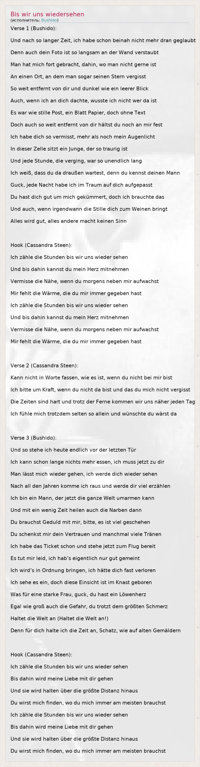 Verse 1 (Bushido): Und nach so langer Zeit, ich habe schon beinah nicht mehr dran geglaubt Denn auch dein Foto ist so langsam an der Wand verstaubt Man hat mich fort gebracht, dahin, wo man nicht gerne ist An einen Ort, an dem man sogar seinen Stern vergisst So weit entfernt von dir und dunkel wie ein leerer Blick Auch, wenn ich an dich dachte, wusste ich nicht wer da ist Es war wie stille Post, ein Blatt Papier, doch ohne Text Doch auch so weit entfernt von dir hältst du noch an mir fest Ich habe dich so vermisst, mehr als noch mein Augenlicht In dieser Zelle sitzt ein Junge, der so traurig ist Und jede Stunde, die verging, war so unendlich lang Ich weiß, dass du da draußen wartest, denn du kennst deinen Mann Guck, jede Nacht habe ich im Traum auf dich aufgepasst Du hast dich gut um mich gekümmert, doch ich brauchte das Und auch, wenn irgendwann die Stille dich zum Weinen bringt Alles wird gut, alles andere macht keinen Sinn Hook (Cassandra Steen): Ich zähle die Stunden bis wir uns wieder sehen Und bis dahin kannst du mein Herz mitnehmen Vermisse die Nähe, wenn du morgens neben mir aufwachst Mir fehlt die Wärme, die du mir immer gegeben hast Ich zähle die Stunden bis wir uns wieder sehen Und bis dahin kannst du mein Herz mitnehmen Vermisse die Nähe, wenn du morgens neben mir aufwachst Mir fehlt die Wärme, die du mir immer gegeben hast Verse 2 (Cassandra Steen): Kann nicht in Worte fassen, wie es ist, wenn du nicht bei mir bist Ich bitte um Kraft, wenn du nicht da bist und das du mich nicht vergisst Die Zeiten sind hart und trotz der Ferne kommen wir uns näher jeden Tag Ich fühle mich trotzdem selten so allein und wünschte du wärst da Verse 3 (Bushido): Und so stehe ich heute endlich vor der letzten Tür Ich kann schon lange nichts mehr essen, ich muss jetzt zu dir Man lässt mich wieder gehen, ich werde dich wieder sehen Nach all den Jahren komme ich raus und werde dir viel erzählen Ich bin ein Mann, der jetzt die ganze Welt umarmen kann Und mit ein wenig Zeit heilen auch die Narben dann Du brauchst Geduld mit mir, bitte, es ist viel geschehen Du schenkst mir dein Vertrauen und manchmal viele Tränen Ich habe das Ticket schon und stehe jetzt zum Flug bereit Es tut mir leid, ich hab’s eigentlich nur gut gemeint Ich wird’s in Ordnung bringen, ich hätte dich fast verloren Ich sehe es ein, doch diese Einsicht ist im Knast geboren Was für eine starke Frau, guck, du hast ein Löwenherz Egal wie groß auch die Gefahr, du trotzt dem größten Schmerz Haltet die Welt an (Haltet die Welt an!) Denn für dich halte ich die Zeit an, Schatz, wie auf alten Gemäldern Hook (Cassandra Steen): Ich zähle die Stunden bis wir uns wieder sehen Bis dahin wird meine Liebe mit dir gehen Und sie wird halten über die größte Distanz hinaus Du wirst mich finden, wo du mich immer am meisten brauchst Ich zähle die Stunden bis wir uns wieder sehen Bis dahin wird meine Liebe mit dir gehen Und sie wird halten über die größte Distanz hinaus Du wirst mich finden, wo du mich immer am meisten brauchst
