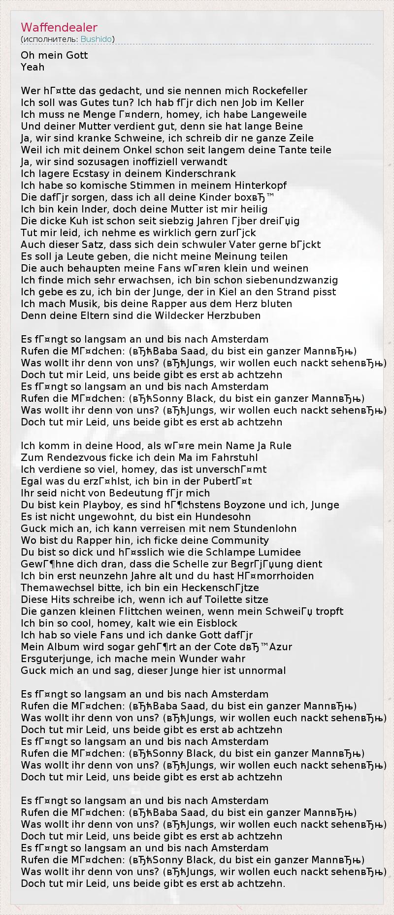Oh mein Gott Yeah Wer hätte das gedacht, und sie nennen mich Rockefeller Ich soll was Gutes tun? Ich hab für dich nen Job im Keller Ich muss ne Menge ändern, homey, ich habe Langeweile Und deiner Mutter verdient gut, denn sie hat lange Beine Ja, wir sind kranke Schweine, ich schreib dir ne ganze Zeile Weil ich mit deinem Onkel schon seit langem deine Tante teile Ja, wir sind sozusagen inoffiziell verwandt Ich lagere Ecstasy in deinem Kinderschrank Ich habe so komische Stimmen in meinem Hinterkopf Die dafür sorgen, dass ich all deine Kinder box’ Ich bin kein Inder, doch deine Mutter ist mir heilig Die dicke Kuh ist schon seit siebzig Jahren über dreißig Tut mir leid, ich nehme es wirklich gern zurück Auch dieser Satz, dass sich dein schwuler Vater gerne bückt Es soll ja Leute geben, die nicht meine Meinung teilen Die auch behaupten meine Fans wären klein und weinen Ich finde mich sehr erwachsen, ich bin schon siebenundzwanzig Ich gebe es zu, ich bin der Junge, der in Kiel an den Strand pisst Ich mach Musik, bis deine Rapper aus dem Herz bluten Denn deine Eltern sind die Wildecker Herzbuben Es fängt so langsam an und bis nach Amsterdam Rufen die Mädchen: („Baba Saad, du bist ein ganzer Mann“) Was wollt ihr denn von uns? („Jungs, wir wollen euch nackt sehen“) Doch tut mir Leid, uns beide gibt es erst ab achtzehn Es fängt so langsam an und bis nach Amsterdam Rufen die Mädchen: („Sonny Black, du bist ein ganzer Mann“) Was wollt ihr denn von uns? („Jungs, wir wollen euch nackt sehen“) Doch tut mir Leid, uns beide gibt es erst ab achtzehn Ich komm in deine Hood, als wäre mein Name Ja Rule Zum Rendezvous ficke ich dein Ma im Fahrstuhl Ich verdiene so viel, homey, das ist unverschämt Egal was du erzählst, ich bin in der Pubertät Ihr seid nicht von Bedeutung für mich Du bist kein Playboy, es sind höchstens Boyzone und ich, Junge Es ist nicht ungewohnt, du bist ein Hundesohn Guck mich an, ich kann verreisen mit nem Stundenlohn Wo bist du Rapper hin, ich ficke deine Community Du bist so dick und hässlich wie die Schlampe Lumidee Gewöhne dich dran, dass die Schelle zur Begrüßung dient Ich bin erst neunzehn Jahre alt und du hast Hämorrhoiden Themawechsel bitte, ich bin ein Heckenschütze Diese Hits schreibe ich, wenn ich auf Toilette sitze Die ganzen kleinen Flittchen weinen, wenn mein Schweiß tropft Ich bin so cool, homey, kalt wie ein Eisblock Ich hab so viele Fans und ich danke Gott dafür Mein Album wird sogar gehört an der Cote d’Azur Ersguterjunge, ich mache mein Wunder wahr Guck mich an und sag, dieser Junge hier ist unnormal Es fängt so langsam an und bis nach Amsterdam Rufen die Mädchen: („Baba Saad, du bist ein ganzer Mann“) Was wollt ihr denn von uns? („Jungs, wir wollen euch nackt sehen“) Doch tut mir Leid, uns beide gibt es erst ab achtzehn Es fängt so langsam an und bis nach Amsterdam Rufen die Mädchen: („Sonny Black, du bist ein ganzer Mann“) Was wollt ihr denn von uns? („Jungs, wir wollen euch nackt sehen“) Doch tut mir Leid, uns beide gibt es erst ab achtzehn Es fängt so langsam an und bis nach Amsterdam Rufen die Mädchen: („Baba Saad, du bist ein ganzer Mann“) Was wollt ihr denn von uns? („Jungs, wir wollen euch nackt sehen“) Doch tut mir Leid, uns beide gibt es erst ab achtzehn Es fängt so langsam an und bis nach Amsterdam Rufen die Mädchen: („Sonny Black, du bist ein ganzer Mann“) Was wollt ihr denn von uns? („Jungs, wir wollen euch nackt sehen“) Doch tut mir Leid, uns beide gibt es erst ab achtzehn.