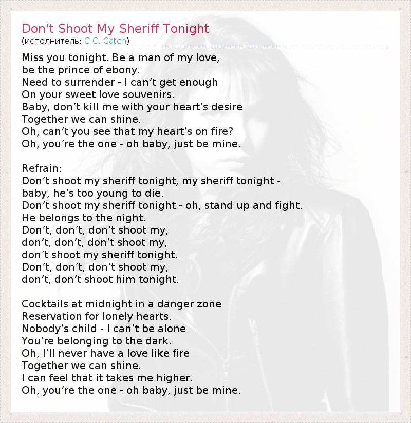 Miss you tonight. Be a man of my love, be the prince of ebony. Need to surrender - I can’t get enough On your sweet love souvenirs. Baby, don’t kill me with your heart’s desire Together we can shine. Oh, can’t you see that my heart’s on fire? Oh, you’re the one - oh baby, just be mine. Refrain: Don’t shoot my sheriff tonight, my sheriff tonight - baby, he’s too young to die. Don’t shoot my sheriff tonight - oh, stand up and fight. He belongs to the night. Don’t, don’t, don’t shoot my, don’t, don’t, don’t shoot my, don’t shoot my sheriff tonight. Don’t, don’t, don’t shoot my, don’t, don’t shoot him tonight. Cocktails at midnight in a danger zone Reservation for lonely hearts. Nobody’s child - I can’t be alone You’re belonging to the dark. Oh, I’ll never have a love like fire Together we can shine. I can feel that it takes me higher. Oh, you’re the one - oh baby, just be mine.