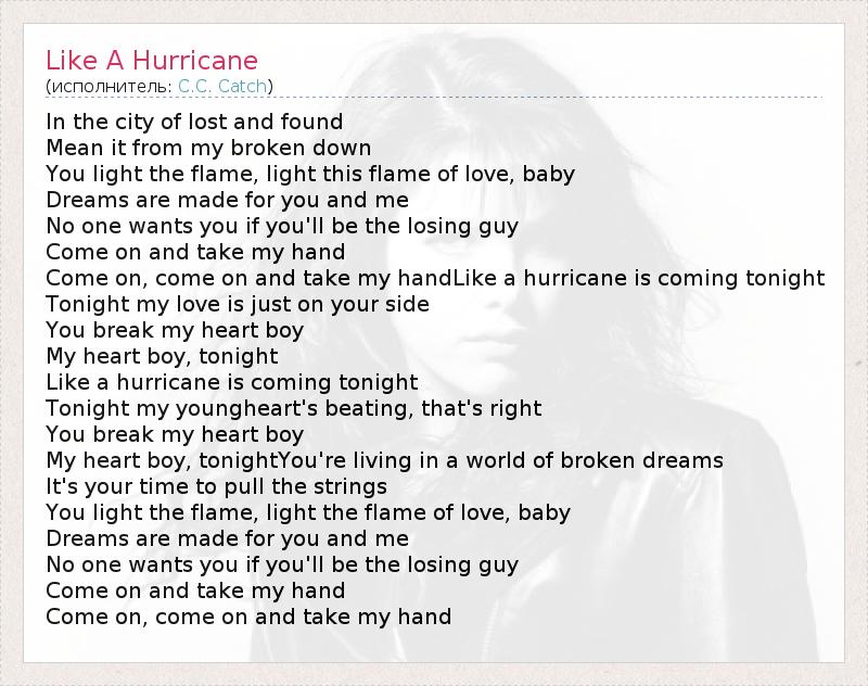 In the city of lost and found Mean it from my broken down You light the flame, light this flame of love, baby Dreams are made for you and me No one wants you if you'll be the losing guy Come on and take my hand Come on, come on and take my handLike a hurricane is coming tonight Tonight my love is just on your side You break my heart boy My heart boy, tonight Like a hurricane is coming tonight Tonight my youngheart's beating, that's right You break my heart boy My heart boy, tonightYou're living in a world of broken dreams It's your time to pull the strings You light the flame, light the flame of love, baby Dreams are made for you and me No one wants you if you'll be the losing guy Come on and take my hand Come on, come on and take my hand