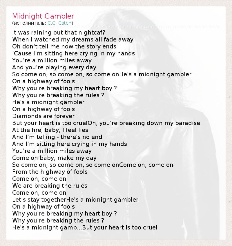 It was raining out that nightcaf? When I watched my dreams all fade away Oh don't tell me how the story ends 'Cause I'm sitting here crying in my hands You're a million miles away And you're playing every day So come on, so come on, so come onHe's a midnight gambler On a highway of fools Why you're breaking my heart boy ? Why you're breaking the rules ? He's a midnight gambler On a highway of fools Diamonds are forever But your heart is too cruelOh, you're breaking down my paradise At the fire, baby, I feel lies And I'm telling - there's no end And I'm sitting here crying in my hands You're a million miles away Come on baby, make my day So come on, so come on, so come onCome on, come on From the highway of fools Come on, come on We are breaking the rules Come on, come on Let's stay togetherHe's a midnight gambler On a highway of fools Why you're breaking my heart boy ? Why you're breaking the rules ? He's a midnight gamb...But your heart is too cruel