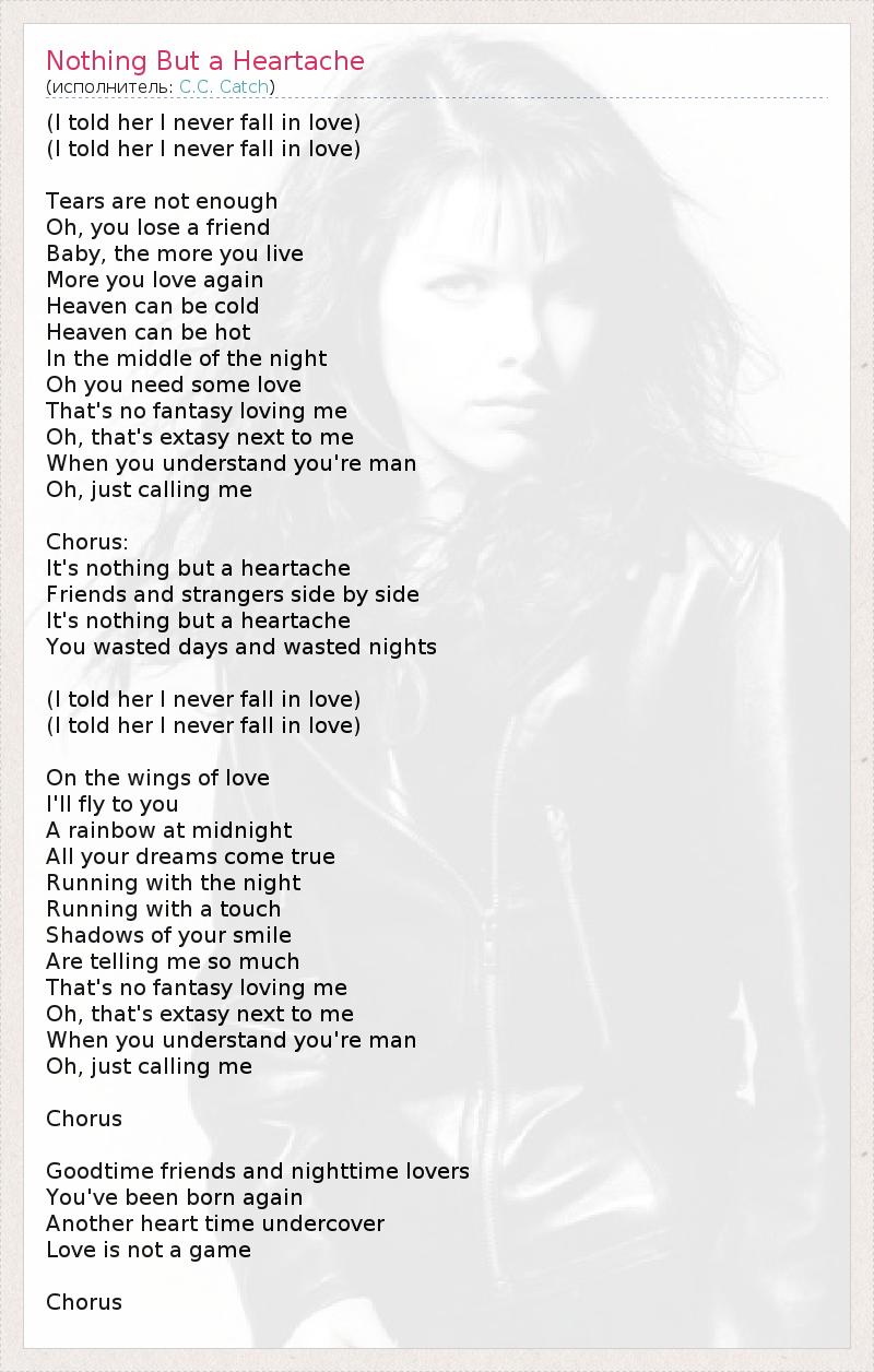 (I told her I never fall in love) (I told her I never fall in love) Tears are not enough Oh, you lose a friend Baby, the more you live More you love again Heaven can be cold Heaven can be hot In the middle of the night Oh you need some love That's no fantasy loving me Oh, that's extasy next to me When you understand you're man Oh, just calling me Chorus: It's nothing but a heartache Friends and strangers side by side It's nothing but a heartache You wasted days and wasted nights (I told her I never fall in love) (I told her I never fall in love) On the wings of love I'll fly to you A rainbow at midnight All your dreams come true Running with the night Running with a touch Shadows of your smile Are telling me so much That's no fantasy loving me Oh, that's extasy next to me When you understand you're man Oh, just calling me Chorus Goodtime friends and nighttime lovers You've been born again Another heart time undercover Love is not a game Chorus