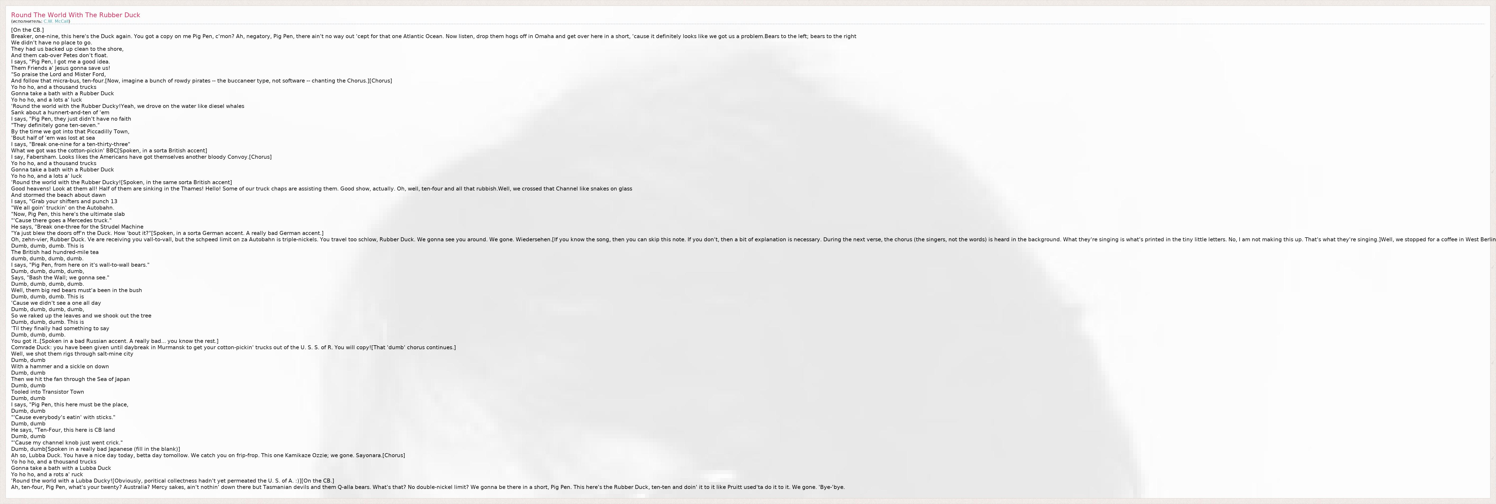 Oh, zehn-vier, Rubber Duck. Ve are receiving you vall-to-vall, but the schpeed limit on za Autobahn is triple-nickels. You travel too schlow, Rubber Duck. We gonna see you around. We gone. Wiedersehen.[If you know the song, then you can skip this note. If you don't, then a bit of explanation is necessary. During the next verse, the chorus (the singers, not the words) is heard in the background. What they're singing is what's printed in the tiny little letters. No, I am not making this up. That's what they're singing.]Well, we stopped for a coffee in West Berlin