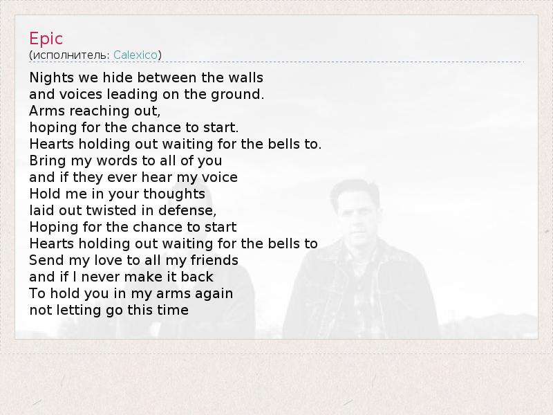 Это интересно:Calexico — современный американский музыкальный коллектив, играющий альтернативное кантри с заметным влиянием мексиканских и латиноамериканских мотивов. Группа была образована в 1996 году вокалистом и гитаристом Джоуи Бёрнсом и барабанщиком Джоном Конвертино в городе Таксон штата Аризона.Текущий состав:Джоуи Бёрнс (Joey Burns) — вокал, гитараДжон Конвертино (John Convertino) — ударные... продолжение
