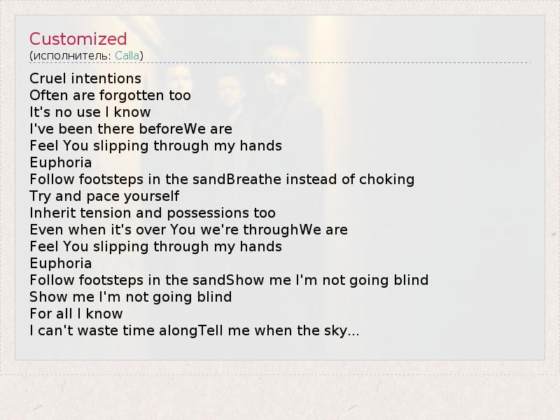 Cruel intentions Often are forgotten too It's no use I know I've been there beforeWe are Feel You slipping through my hands Euphoria Follow footsteps in the sandBreathe instead of choking Try and pace yourself Inherit tension and possessions too Even when it's over You we're throughWe are Feel You slipping through my hands Euphoria Follow footsteps in the sandShow me I'm not going blind Show me I'm not going blind For all I know I can't waste time alongTell me when the sky...