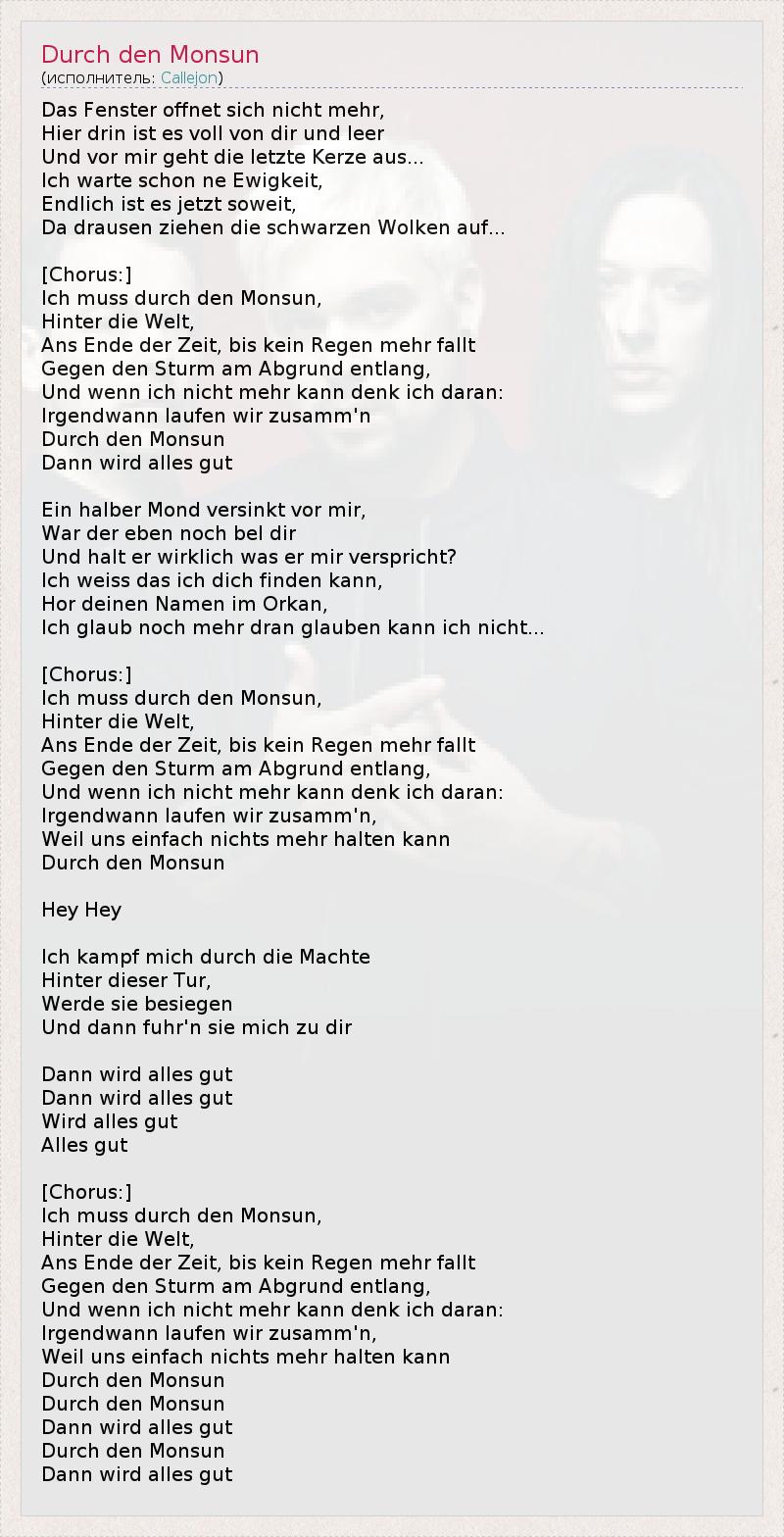 Das Fenster offnet sich nicht mehr, Hier drin ist es voll von dir und leer Und vor mir geht die letzte Kerze aus... Ich warte schon ne Ewigkeit, Endlich ist es jetzt soweit, Da drausen ziehen die schwarzen Wolken auf... [Chorus:] Ich muss durch den Monsun, Hinter die Welt, Ans Ende der Zeit, bis kein Regen mehr fallt Gegen den Sturm am Abgrund entlang, Und wenn ich nicht mehr kann denk ich daran: Irgendwann laufen wir zusamm'n Durch den Monsun Dann wird alles gut Ein halber Mond versinkt vor mir, War der eben noch beI dir Und halt er wirklich was er mir verspricht? Ich weiss das ich dich finden kann, Hor deinen Namen im Orkan, Ich glaub noch mehr dran glauben kann ich nicht... [Chorus:] Ich muss durch den Monsun, Hinter die Welt, Ans Ende der Zeit, bis kein Regen mehr fallt Gegen den Sturm am Abgrund entlang, Und wenn ich nicht mehr kann denk ich daran: Irgendwann laufen wir zusamm'n, Weil uns einfach nichts mehr halten kann Durch den Monsun Hey Hey Ich kampf mich durch die Machte Hinter dieser Tur, Werde sie besiegen Und dann fuhr'n sie mich zu dir Dann wird alles gut Dann wird alles gut Wird alles gut Alles gut [Chorus:] Ich muss durch den Monsun, Hinter die Welt, Ans Ende der Zeit, bis kein Regen mehr fallt Gegen den Sturm am Abgrund entlang, Und wenn ich nicht mehr kann denk ich daran: Irgendwann laufen wir zusamm'n, Weil uns einfach nichts mehr halten kann Durch den Monsun Durch den Monsun Dann wird alles gut Durch den Monsun Dann wird alles gut