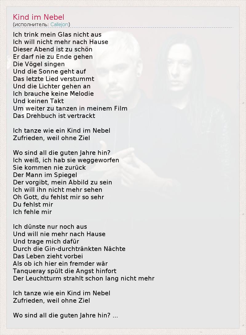 Я не допиваю свой бокал, Я больше не хочу возвращаться домой, Этот вечер слишком прекрасен, Он не должен заканчиваться. Поют птицы, И восходит солнце, Последняя песня затихает, И зажигаются огни. Мне не нужны мелодия И такт, Чтобы танцевать дальше в своем кино С запутанным сценарием. Я танцую, как ребенок в тумане, Довольный, потому что цели нет. Куда делись все хорошие годы? Я знаю, я выбросил их, Они никогда не вернутся. Человек в зеркале, Он притворяется моим отражением, Я не хочу больше видеть его. О боже, мне так не хватает тебя, Мне не хватает тебя, Мне не хватает себя. Я просто выделяю испарения И больше не хочу идти домой, И вместо этого я таскаюсь По пропитанным джином ночам. Жизнь проходит мимо, Словно я здесь чужой. "Tanqueray" смывает страх, Маяк уже давно не светит. Я танцую, как ребенок в тумане, Довольный, потому что цели нет. Куда делись все хорошие годы? ...