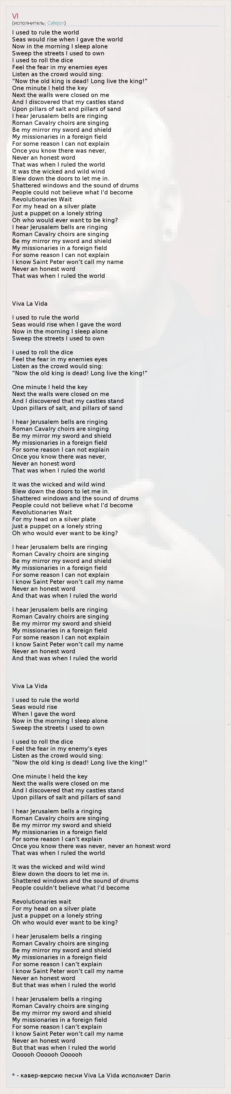 I used to rule the world Seas would rise when I gave the world Now in the morning I sleep alone Sweep the streets I used to own I used to roll the dice Feel the fear in my enemies eyes Listen as the crowd would sing: "Now the old king is dead! Long live the king!" One minute I held the key Next the walls were closed on me And I discovered that my castles stand Upon pillars of salt and pillars of sand I hear Jerusalem bells are ringing Roman Cavalry choirs are singing Be my mirror my sword and shield My missionaries in a foreign field For some reason I can not explain Once you know there was never, Never an honest word That was when I ruled the world It was the wicked and wild wind Blew down the doors to let me in. Shattered windows and the sound of drums People could not believe what I'd become Revolutionaries Wait For my head on a silver plate Just a puppet on a lonely string Oh who would ever want to be king? I hear Jerusalem bells are ringing Roman Cavalry choirs are singing Be my mirror my sword and shield My missionaries in a foreign field For some reason I can not explain I know Saint Peter won't call my name Never an honest word That was when I ruled the world Viva La Vida I used to rule the world Seas would rise when I gave the word Now in the morning I sleep alone Sweep the streets I used to own I used to roll the dice Feel the fear in my enemies eyes Listen as the crowd would sing: "Now the old king is dead! Long live the king!" One minute I held the key Next the walls were closed on me And I discovered that my castles stand Upon pillars of salt, and pillars of sand I hear Jerusalem bells are ringing Roman Cavalry choirs are singing Be my mirror my sword and shield My missionaries in a foreign field For some reason I can not explain Once you know there was never, Never an honest word That was when I ruled the world It was the wicked and wild wind Blew down the doors to let me in. Shattered windows and the sound of drums People could not believe what I'd become Revolutionaries Wait For my head on a silver plate Just a puppet on a lonely string Oh who would ever want to be king? I hear Jerusalem bells are ringing Roman Cavalry choirs are singing Be my mirror my sword and shield My missionaries in a foreign field For some reason I can not explain I know Saint Peter won't call my name Never an honest word And that was when I ruled the world I hear Jerusalem bells are ringing Roman Cavalry choirs are singing Be my mirror my sword and shield My missionaries in a foreign field For some reason I can not explain I know Saint Peter won't call my name Never an honest word And that was when I ruled the world Viva La Vida I used to rule the world Seas would rise When I gave the word Now in the morning I sleep alone Sweep the streets I used to own I used to roll the dice Feel the fear in my enemy's eyes Listen as the crowd would sing: "Now the old king is dead! Long live the king!" One minute I held the key Next the walls were closed on me And I discovered that my castles stand Upon pillars of salt and pillars of sand I hear Jerusalem bells a ringing Roman Cavalry choirs are singing Be my mirror my sword and shield My missionaries in a foreign field For some reason I can't explain Once you know there was never, never an honest word That was when I ruled the world It was the wicked and wild wind Blew down the doors to let me in. Shattered windows and the sound of drums People couldn't believe what I'd become Revolutionaries wait For my head on a silver plate Just a puppet on a lonely string Oh who would ever want to be king? I hear Jerusalem bells a ringing Roman Cavalry choirs are singing Be my mirror my sword and shield My missionaries in a foreign field For some reason I can't explain I know Saint Peter won't call my name Never an honest word But that was when I ruled the world I hear Jerusalem bells a ringing Roman Cavalry choirs are singing Be my mirror my sword and shield My missionaries in a foreign field For some reason I can't explain I know Saint Peter won't call my name Never an honest word But that was when I ruled the world Oooooh Oooooh Oooooh * - кавер-версию песни Viva La Vida исполняет Darin