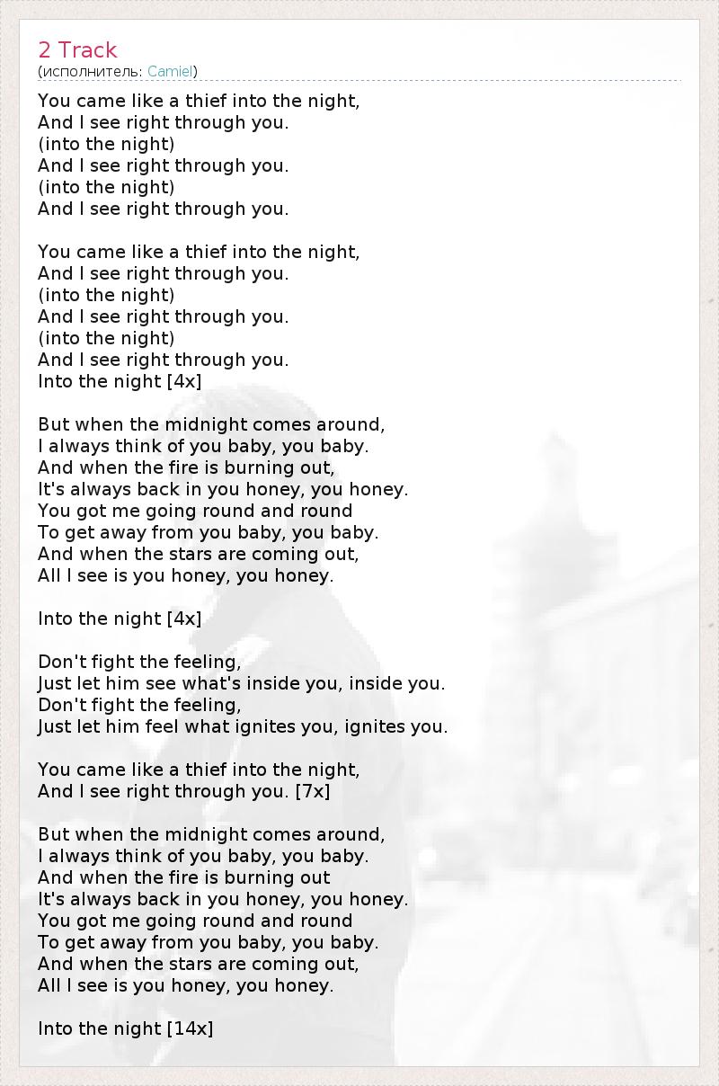 Ты приходил ночью, как вор, Я ж тебя насквозь вижу. (ночью) Я ж тебя насквозь вижу. (ночью) Я ж тебя насквозь вижу. Ты приходил ночью, как вор, Я ж тебя насквозь вижу. (ночью) Я ж тебя насквозь вижу. (ночью) Я ж тебя насквозь вижу. Ночью [4x] Но когда близится полночь, Я всегда думаю о тебе, детка, детка. А когда огонь догорает (во мне), Он снова появляется в тебе, милый, милый. Кружусь да кружусь вокруг тебя, Когда хочу уйти прочь от тебя, детка, детка. А когда появляются звёзды, Не вижу ничего, кроме тебя, милый, милый. Ночью [4x] Не борись с этим чувством, Просто дай ему понять, что у тебя на душе, у тебя на душе. Не борись с этими чувствами, Просто дай ему понять, что тебя заводит, тебя заводит. Ты приходил ночью, как вор, Я ж тебя насквозь вижу. [7x] Но когда близится полночь, Я всегда думаю о тебе, детка, детка. А когда огонь догорает (во мне), Он снова появляется в тебе, милый, милый. Кружусь да кружусь вокруг тебя, Когда хочу уйти прочь от тебя, детка, детка. А когда появляются звёзды, Не вижу ничего, кроме тебя, милый, милый. Ночью [14x]