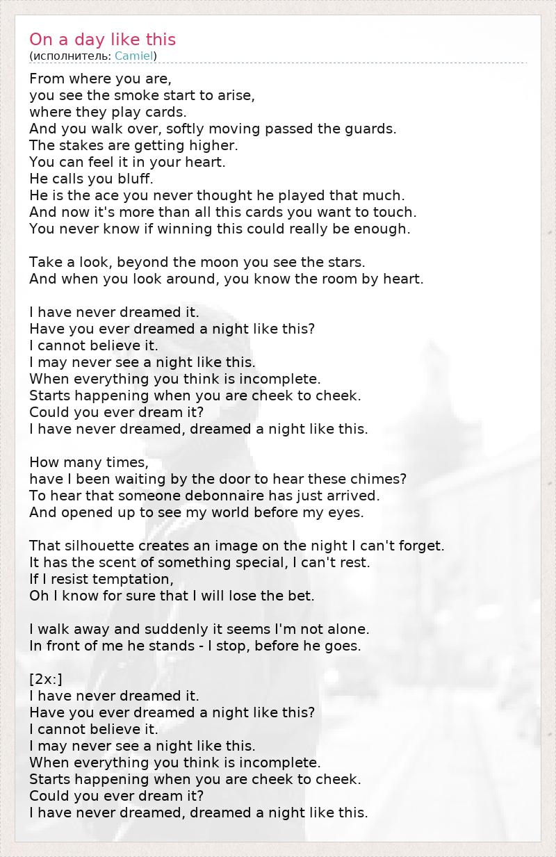 From where you are, you see the smoke start to arise, where they play cards. And you walk over, softly moving passed the guards. The stakes are getting higher. You can feel it in your heart. He calls you bluff. He is the ace you never thought he played that much. And now it's more than all this cards you want to touch. You never know if winning this could really be enough. Take a look, beyond the moon you see the stars. And when you look around, you know the room by heart. I have never dreamed it. Have you ever dreamed a night like this? I cannot believe it. I may never see a night like this. When everything you think is incomplete. Starts happening when you are cheek to cheek. Could you ever dream it? I have never dreamed, dreamed a night like this. How many times, have I been waiting by the door to hear these chimes? To hear that someone debonnaire has just arrived. And opened up to see my world before my eyes. That silhouette creates an image on the night I can't forget. It has the scent of something special, I can't rest. If I resist temptation, Oh I know for sure that I will lose the bet. I walk away and suddenly it seems I'm not alone. In front of me he stands - I stop, before he goes. [2x:] I have never dreamed it. Have you ever dreamed a night like this? I cannot believe it. I may never see a night like this. When everything you think is incomplete. Starts happening when you are cheek to cheek. Could you ever dream it? I have never dreamed, dreamed a night like this.