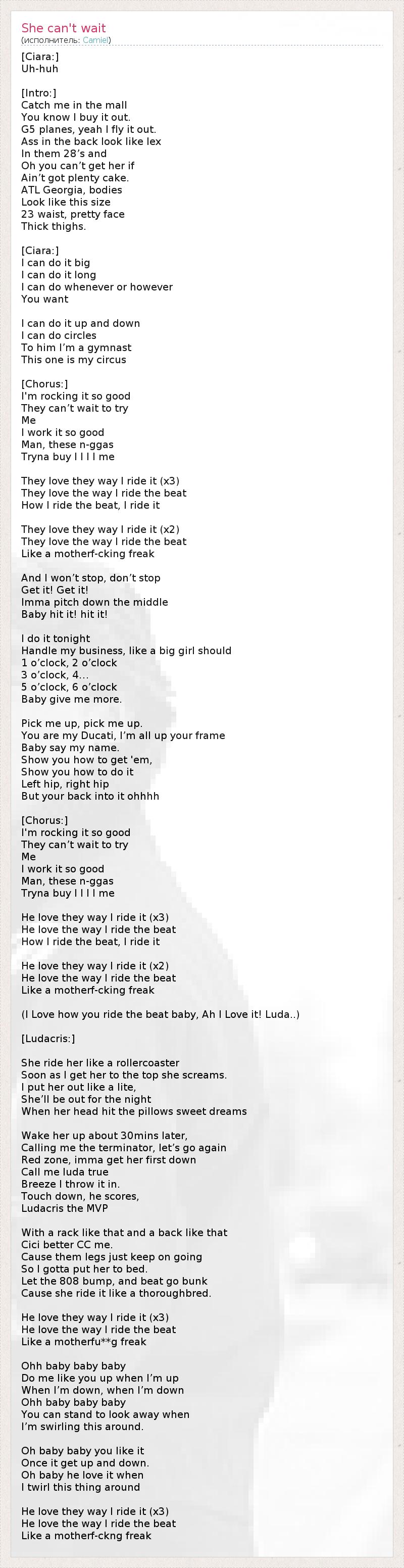 [Ciara:] А-га! [Пролог:] Ты можешь поймать меня в торговом центре - Ты ведь знаешь, что я всё скупаю. Самолёты бизнес-класса, да, я летаю на таких. Зад у неё клёвый, как Lexus С 28-дюймовыми покрышками. Ты не завоюешь её, Если у тебя недостаточно бабла. В Атланте, Джорджия, тела Вот таких пропорций: Талия как у Барби, милое личико, Аппетитные бёдра. [Ciara:] Я могу делать это амплитудно, Могу делать это долго, Могу делать, когда и как Тебе угодно. Я могу двигаться вверх и вниз, Могу двигаться кругами. Для него я гимнастка, А это - мой цирк. [Припев:] Я так здорово зажигаю, Они ждут не дождутся, чтобы попробовать Меня. Я так хорошо это делаю, Чёрт, эти ниг*еры Пытаются купить меня. Они прутся от того, как я езжу верхом (3 раза) Они кайфуют от того, как я двигаюсь в такт, Как я оседлала этот ритм. Они прутся от того, как я езжу верхом (2 раза) Они кайфуют от того, как я двигаюсь в такт, Как, чёрт возьми, помешанная! И я не остановлюсь, не остановлюсь, Вот так! Понятно? Я низко опущусь по центру, Малыш, двигайся! Делай это быстрее! Я делаю это сегодня ночью, Занимаюсь своим делом, как следует большой девочке. Час ночи, 2 часа, 3 часа, 4... 5 часов, 6 утра... Малыш, я хочу ещё... Подвези меня, подвези меня, Ты мой Дукати*, я крепко обхватила твою "раму". Малыш, позови меня, И я покажу, как достичь пика, Я покажу, как это делать. Левое бедро, правое бедро, Но ты даёшь задний ход, о-о... [Припев:] Я так здорово зажигаю, Они ждут не дождутся, чтобы попробовать Меня. Я так хорошо это делаю, Чёрт, эти ниг*еры Пытаются купить меня. Он прётся от того, как я езжу верхом (3 раза) Он кайфует от того, как я двигаюсь в такт, Как я оседлала этот ритм. Он прётся от того, как я езжу верхом (2 раза) Он кайфует от того, как я двигаюсь в такт, Как, чёрт возьми, помешанная! Мне нравится, как ты попадаешь в ритм, малыш, обожаю это! Luda...) [Ludacris:] Она катается на мне, как на американских горках. Как только я довожу её до пика, она кричит. Я гашу её, как свет. Потом она всю ночь в отключке: Как только голова её коснётся подушки, она погружается в сладкие сны. Бужу её через 30 минут. Она называет меня терминатором: Давай ещё раз! Красная зона - сначала я её обрабатываю, Она называет меня "Luda преданный". Я добавляю лёгкого ветерку. Касание - я набираю очко, Ludacris - основной игрок**. С такой грудью и таким задом, Cici***, лучше поласкай меня. А она продолжает работать ногами, Поэтому я должен уложить её в постель. Пусть гремят усилители и стучит бит, Она ездит на мне верхом, как на чистокровном скакуне. Он прётся от того, как я езжу верхом (2 раза) Он кайфует от того, как я двигаюсь в такт, Как, чёрт возьми, помешанная! О, малыш, малыш, малыш, Обработай меня, словно ты всегда наготове, когда мне нужно, И когда мне грустно, грустно. О, малыш, малыш, малыш, Ты не можешь отвернуться, Когда я вращаю бёдрами по кругу. О, малыш, малыш, тебе нравится это, Как только я начинаю движение вверх и вниз. О, малыш, он обожает, Когда я двигаю бёдрами по кругу. Он прётся от того, как я езжу верхом (3 раза) Он кайфует от того, как я двигаюсь в такт, Как, чёрт возьми, помешанная! * - MVP - most valuable person досл.: самая важная персона ** - Ferrari среди мотоциклов, очень хороший мотоцикл *** - ник Ciara