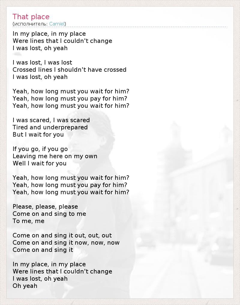 In my place, in my place Were lines that I couldn't change I was lost, oh yeah I was lost, I was lost Crossed lines I shouldn't have crossed I was lost, oh yeah Yeah, how long must you wait for him? Yeah, how long must you pay for him? Yeah, how long must you wait for him? I was scared, I was scared Tired and underprepared But I wait for you If you go, if you go Leaving me here on my own Well I wait for you Yeah, how long must you wait for him? Yeah, how long must you pay for him? Yeah, how long must you wait for him? Please, please, please Come on and sing to me To me, me Come on and sing it out, out, out Come on and sing it now, now, now Come on and sing it In my place, in my place Were lines that I couldn't change I was lost, oh yeah Oh yeah
