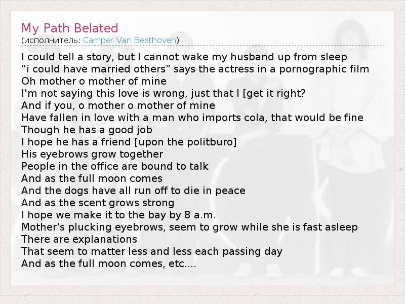 I could tell a story, but I cannot wake my husband up from sleep "i could have married others" says the actress in a pornographic film Oh mother o mother of mine I'm not saying this love is wrong, just that I [get it right? And if you, o mother o mother of mine Have fallen in love with a man who imports cola, that would be fine Though he has a good job I hope he has a friend [upon the politburo] His eyebrows grow together People in the office are bound to talk And as the full moon comes And the dogs have all run off to die in peace And as the scent grows strong I hope we make it to the bay by 8 a.m. Mother's plucking eyebrows, seem to grow while she is fast asleep There are explanations That seem to matter less and less each passing day And as the full moon comes, etc....