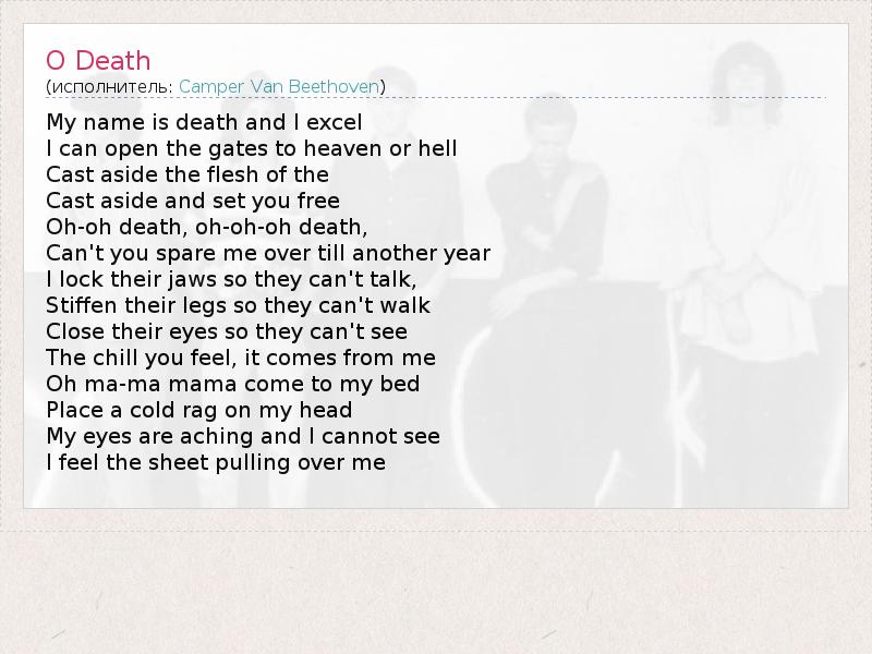My name is death and I excel I can open the gates to heaven or hell Cast aside the flesh of the Cast aside and set you free Oh-oh death, oh-oh-oh death, Can't you spare me over till another year I lock their jaws so they can't talk, Stiffen their legs so they can't walk Close their eyes so they can't see The chill you feel, it comes from me Oh ma-ma mama come to my bed Place a cold rag on my head My eyes are aching and I cannot see I feel the sheet pulling over me