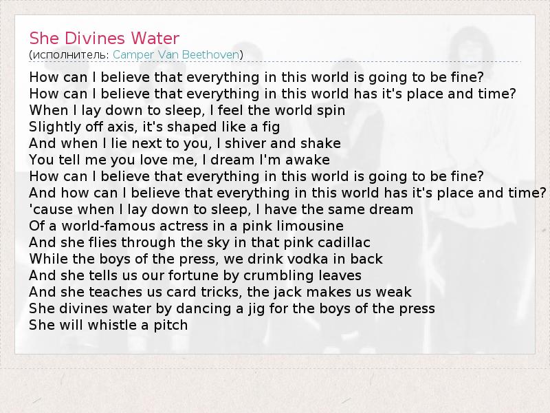 How can I believe that everything in this world is going to be fine? How can I believe that everything in this world has it's place and time? When I lay down to sleep, I feel the world spin Slightly off axis, it's shaped like a fig And when I lie next to you, I shiver and shake You tell me you love me, I dream I'm awake How can I believe that everything in this world is going to be fine? And how can I believe that everything in this world has it's place and time? 'cause when I lay down to sleep, I have the same dream Of a world-famous actress in a pink limousine And she flies through the sky in that pink cadillac While the boys of the press, we drink vodka in back And she tells us our fortune by crumbling leaves And she teaches us card tricks, the jack makes us weak She divines water by dancing a jig for the boys of the press She will whistle a pitch