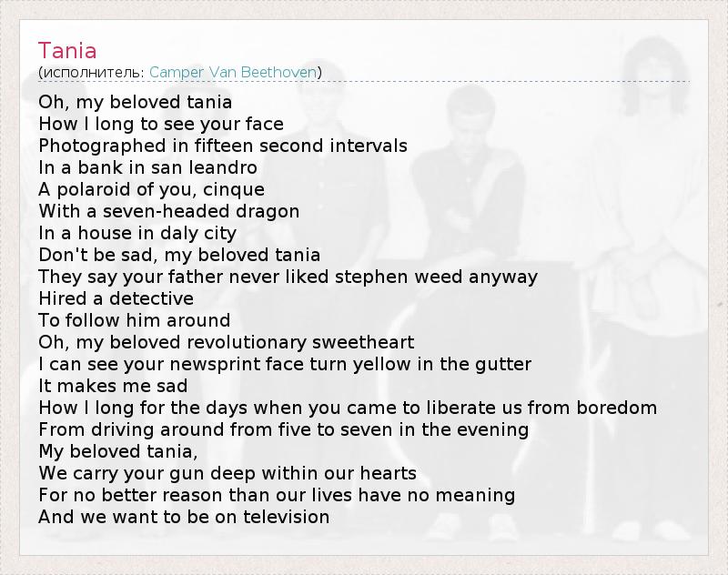 Oh, my beloved tania How I long to see your face Photographed in fifteen second intervals In a bank in san leandro A polaroid of you, cinque With a seven-headed dragon In a house in daly city Don't be sad, my beloved tania They say your father never liked stephen weed anyway Hired a detective To follow him around Oh, my beloved revolutionary sweetheart I can see your newsprint face turn yellow in the gutter It makes me sad How I long for the days when you came to liberate us from boredom From driving around from five to seven in the evening My beloved tania, We carry your gun deep within our hearts For no better reason than our lives have no meaning And we want to be on television