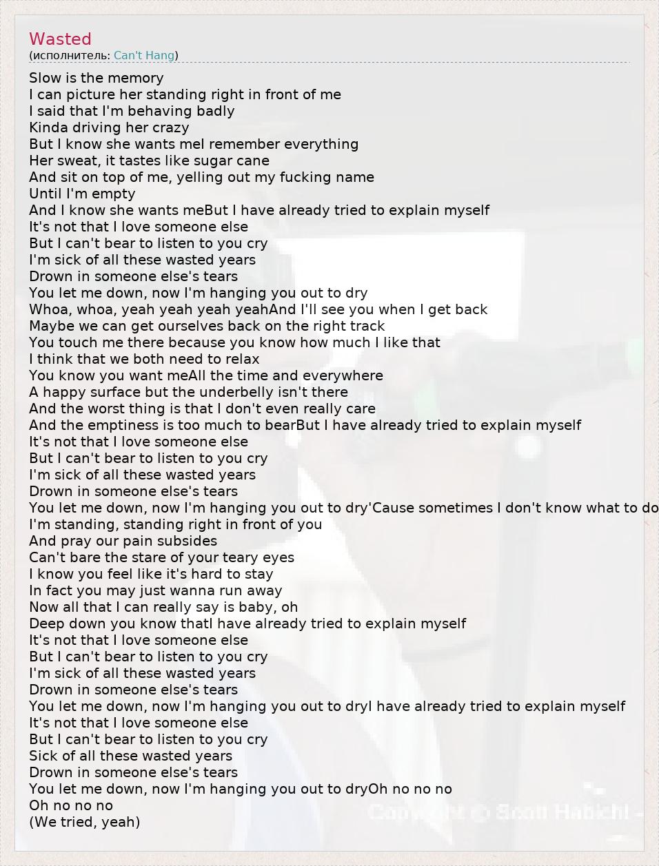 Slow is the memory I can picture her standing right in front of me I said that I'm behaving badly Kinda driving her crazy But I know she wants meI remember everything Her sweat, it tastes like sugar cane And sit on top of me, yelling out my fucking name Until I'm empty And I know she wants meBut I have already tried to explain myself It's not that I love someone else But I can't bear to listen to you cry I'm sick of all these wasted years Drown in someone else's tears You let me down, now I'm hanging you out to dry Whoa, whoa, yeah yeah yeah yeahAnd I'll see you when I get back Maybe we can get ourselves back on the right track You touch me there because you know how much I like that I think that we both need to relax You know you want meAll the time and everywhere A happy surface but the underbelly isn't there And the worst thing is that I don't even really care And the emptiness is too much to bearBut I have already tried to explain myself It's not that I love someone else But I can't bear to listen to you cry I'm sick of all these wasted years Drown in someone else's tears You let me down, now I'm hanging you out to dry'Cause sometimes I don't know what to do I'm standing, standing right in front of you And pray our pain subsides Can't bare the stare of your teary eyes I know you feel like it's hard to stay In fact you may just wanna run away Now all that I can really say is baby, oh Deep down you know thatI have already tried to explain myself It's not that I love someone else But I can't bear to listen to you cry I'm sick of all these wasted years Drown in someone else's tears You let me down, now I'm hanging you out to dryI have already tried to explain myself It's not that I love someone else But I can't bear to listen to you cry Sick of all these wasted years Drown in someone else's tears You let me down, now I'm hanging you out to dryOh no no no Oh no no no (We tried, yeah)