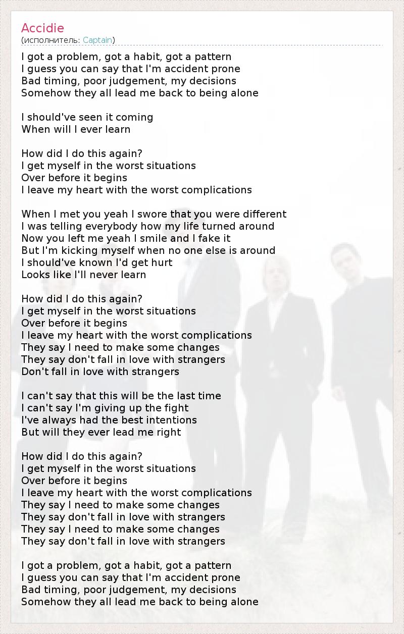 I got a problem, got a habit, got a pattern I guess you can say that I'm accident prone Bad timing, poor judgement, my decisions Somehow they all lead me back to being alone I should've seen it coming When will I ever learn How did I do this again? I get myself in the worst situations Over before it begins I leave my heart with the worst complications When I met you yeah I swore that you were different I was telling everybody how my life turned around Now you left me yeah I smile and I fake it But I'm kicking myself when no one else is around I should've known I'd get hurt Looks like I'll never learn How did I do this again? I get myself in the worst situations Over before it begins I leave my heart with the worst complications They say I need to make some changes They say don't fall in love with strangers Don't fall in love with strangers I can't say that this will be the last time I can't say I'm giving up the fight I've always had the best intentions But will they ever lead me right How did I do this again? I get myself in the worst situations Over before it begins I leave my heart with the worst complications They say I need to make some changes They say don't fall in love with strangers They say I need to make some changes They say don't fall in love with strangers I got a problem, got a habit, got a pattern I guess you can say that I'm accident prone Bad timing, poor judgement, my decisions Somehow they all lead me back to being alone