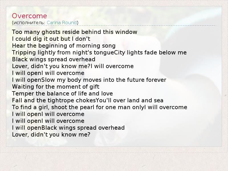 Too many ghosts reside behind this window I could dig it out but I don't Hear the beginning of morning song Tripping lightly from night's tongueCity lights fade below me Black wings spread overhead Lover, didn't you know me?I will overcome I will openI will overcome I will openSlow my body moves into the future forever Waiting for the moment of gift Temper the balance of life and love Fall and the tightrope chokesYou'll over land and sea To find a girl, shoot the pearl for one man onlyI will overcome I will openI will overcome I will openI will overcome I will openBlack wings spread overhead Lover, didn't you know me?