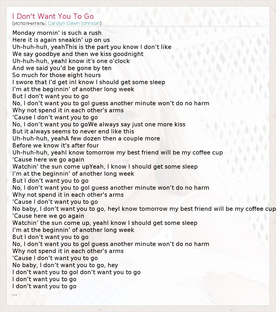 Monday mornin' is such a rush Here it is again sneakin' up on us Uh-huh-huh, yeahThis is the part you know I don't like We say goodbye and then we kiss goodnight Uh-huh-huh, yeahI know it's one o'clock And we said you'd be gone by ten So much for those eight hours I swore that I'd get inI know I should get some sleep I'm at the beginnin' of another long week But I don't want you to go No, I don't want you to goI guess another minute won't do no harm Why not spend it in each other's arms 'Cause I don't want you to go No, I don't want you to goWe always say just one more kiss But it always seems to never end like this Uh-huh-huh, yeahA few dozen then a couple more Before we know it's after four Uh-huh-huh, yeahI know tomorrow my best friend will be my coffee cup 'Cause here we go again Watchin' the sun come upYeah, I know I should get some sleep I'm at the beginnin' of another long week But I don't want you to go No, I don't want you to goI guess another minute won't do no harm Why not spend it in each other's arms 'Cause I don't want you to go No baby, I don't want you to go, heyI know tomorrow my best friend will be my coffee cup 'Cause here we go again Watchin' the sun come up, yeahI know I should get some sleep I'm at the beginnin' of another long week But I don't want you to go No, I don't want you to goI guess another minute won't do no harm Why not spend it in each other's arms 'Cause I don't want you to go No baby, I don't want you to go, hey I don't want you to goI don't want you to go I don't want you to go I don't want you to go ...