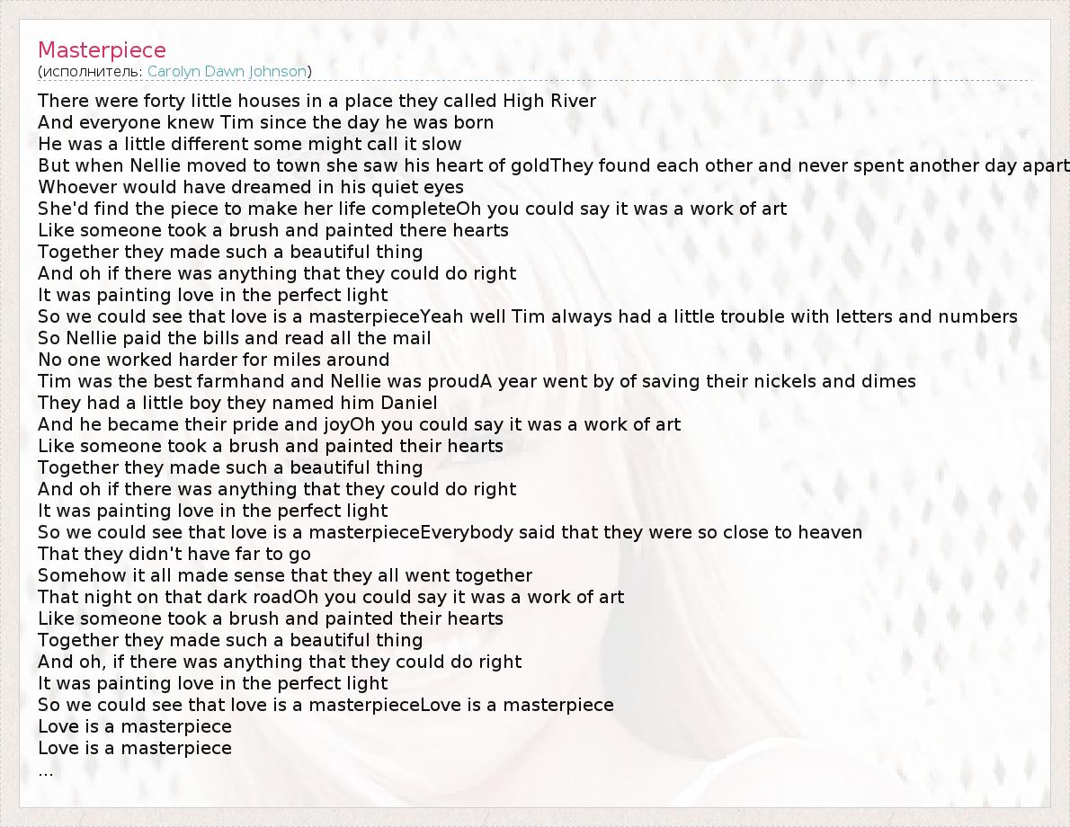 There were forty little houses in a place they called High River And everyone knew Tim since the day he was born He was a little different some might call it slow But when Nellie moved to town she saw his heart of goldThey found each other and never spent another day apart Whoever would have dreamed in his quiet eyes She'd find the piece to make her life completeOh you could say it was a work of art Like someone took a brush and painted there hearts Together they made such a beautiful thing And oh if there was anything that they could do right It was painting love in the perfect light So we could see that love is a masterpieceYeah well Tim always had a little trouble with letters and numbers So Nellie paid the bills and read all the mail No one worked harder for miles around Tim was the best farmhand and Nellie was proudA year went by of saving their nickels and dimes They had a little boy they named him Daniel And he became their pride and joyOh you could say it was a work of art Like someone took a brush and painted their hearts Together they made such a beautiful thing And oh if there was anything that they could do right It was painting love in the perfect light So we could see that love is a masterpieceEverybody said that they were so close to heaven That they didn't have far to go Somehow it all made sense that they all went together That night on that dark roadOh you could say it was a work of art Like someone took a brush and painted their hearts Together they made such a beautiful thing And oh, if there was anything that they could do right It was painting love in the perfect light So we could see that love is a masterpieceLove is a masterpiece Love is a masterpiece Love is a masterpiece ...