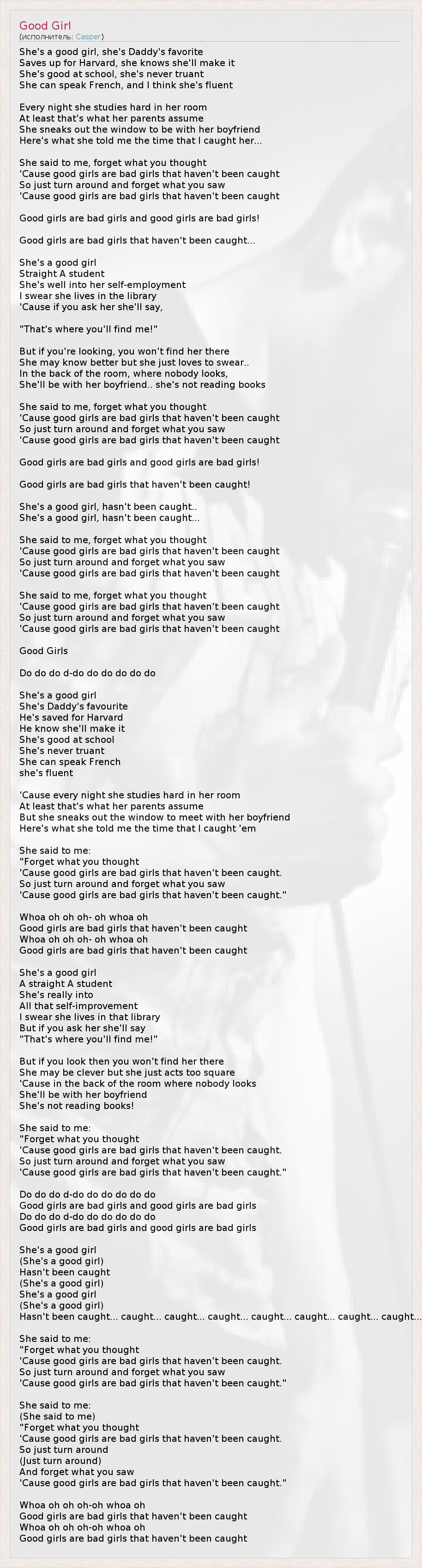 Она хорошая девочка, ее папочка не чает в ней души, Она поступит в Гарвард, она знает, это ей по зубам, Она звезда класса, она ни разу не пропускала занятия, Она свободно говорит по-французски. Каждый вечер она усердно занимается в своей комнате, По крайней мере, так думают ее родители. Она украдкой выбирается через окно, чтобы встретиться со своим парнем. А вот что она рассказала мне, когда я застукал её: Она сказала: "Забудь обо всём, что ты подумал, Потому что все хорошие девочки - это оторвы, которых просто ещё никто не поймал. Так что кругóм и шагом марш, и забудь обо всём, что ты увидел, Потому что все хорошие девочки - это оторвы, которых просто ещё никто не поймал". Хорошие девочки - это оторвы, хорошие девочки - это оторвы. Потому что все хорошие девочки - это оторвы, которых просто ещё никто не застукал. Она хорошая девочка, Круглая отличница. У нее досуг заполнен до предела, Клянусь, она прописалась в библиотеке. И если ты спросишь её, она ответит: "Там меня можно найти". Но на самом деле, ее там не будет, Она, может, и осторожничает, но на деле обожает материться. И в темном углу своей комнаты, где её никто не видит, Она будет вместе со своим парнем... но они не читают книги. Она сказала: "Забудь обо всём, что ты подумал, Потому что все хорошие девочки - это оторвы, которых просто ещё никто не поймал. Так что кругóм и шагом марш, и забудь обо всём, что ты увидел, Потому что все хорошие девочки - это оторвы, которых просто ещё никто не поймал". Хорошие девочки - это оторвы, хорошие девочки - это оторвы. Потому что все хорошие девочки - это оторвы, которых просто ещё никто не застукал. Она - хорошая девочка, которую никто не застукал, Она - хорошая девочка, которую никто не застукал. Она сказала: "Забудь обо всём, что ты подумал, Потому что все хорошие девочки - это оторвы, которых просто ещё никто не поймал. Так что кругóм и шагом марш, и забудь обо всём, что ты увидел, Потому что все хорошие девочки - это оторвы, которых просто ещё никто не поймал". Она сказала: "Забудь обо всём, что ты подумал, Потому что все хорошие девочки - это оторвы, которых просто ещё никто не поймал. Так что кругóм и шагом марш, и забудь обо всём, что ты увидел, Потому что все хорошие девочки - это оторвы, которых просто ещё никто не поймал". Хорошие девочки (перевод Настя Гранат из Саратова) Ду ду ду д-ду ду ду ду ду ду Она хорошая девочка. Любимица папочки. Он откладывал ей на Гарвард, Он знал, что она поступит. Она хороша в учебе, Она никогда не прогуливала занятия. Она говорит на Французском, Я думаю, что довольно бегло. Потому что каждую ночь она зубрит учебники в своей комнате, По крайней мере, это то, что предполагают её родители. Потому что она сбегает через окно на свидание с её парнем. Именно это и сказала она мне, когда я поймал их. Она сказала мне: "Забудь о том, что ты узнал. Потому что хорошие девочки - это плохие девочки, которые еще не были пойманы. Просто проваливай и забудь то, что ты видел. Потому что хорошие девочки - это плохие девочки, которые еще не были пойманы." Воу оу оу оу- оу воу оу Хорошие девочки - это плохие девочки, которые еще не были пойманы. Воу оу оу оу- оу воу оу Хорошие девочки - это плохие девочки, которые еще не были пойманы. Она хорошая девочка, Она отличница. Она действительно увлечена тем, Чтобы сделать себя лучше. Я могу поклясться, что она живет в библиотеке. А если ты спросишь где 