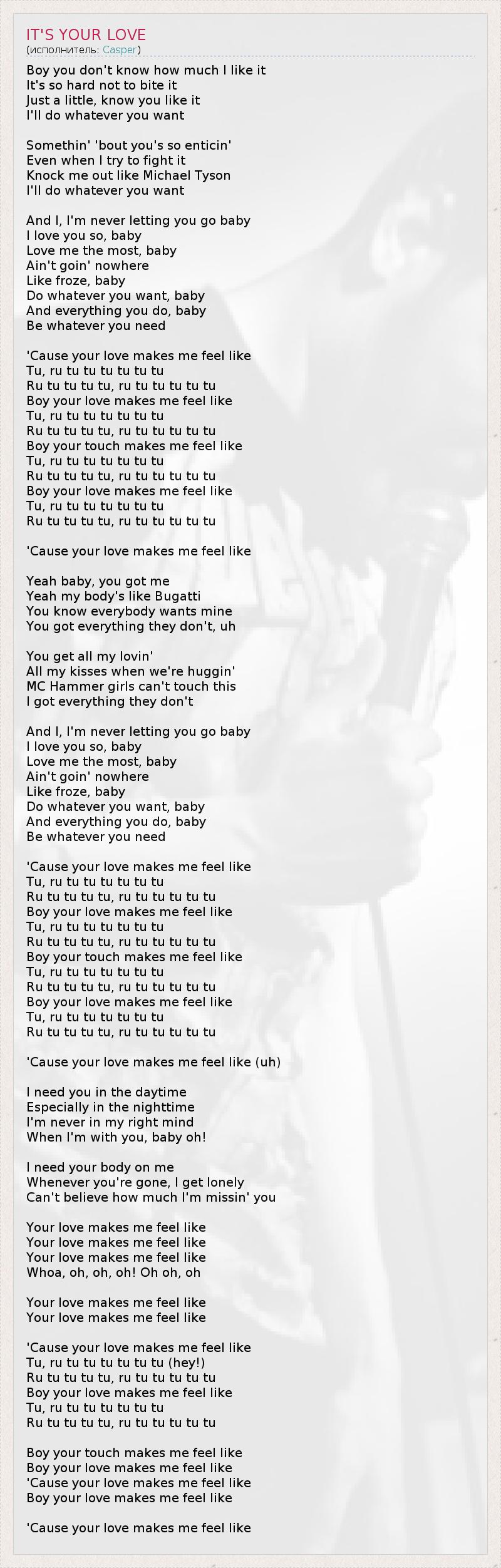 Малыш, ты не представляешь, как мне это нравится! Сложно не укусить. Ну чуть-чуть, я же знаю, тебе нравится! Я сделаю всё, что ты хочешь. Что-то есть в тебе такое заманчивое... Даже если я начинаю сопротивляться, Ты вырубаешь меня, как Майкл Тайсон! Я сделаю всё, что ты хочешь. И я, я никогда тебя не отпущу, Я так тебя люблю, милый, И ты люби меня больше всех! Я никуда не ухожу, Я словно застыла на месте, малыш. Делай всё, что захочешь, И что бы ты ни делал, милый, Я буду тем, что тебе нужно! Потому что твоя любовь делает меня такой Ту, ру, ту, ту, ту... Ру, ту, ту, ту... Малыш, твоя любовь делает меня такой Ту, ру, ту, ту, ту... Ру, ту, ту, ту... Малыш, твои прикосновения делают меня такой Ту, ру, ту, ту, ту... Ру, ту, ту, ту... Малыш, твоя любовь делает меня такой Ту, ру, ту, ту, ту... Ру, ту, ту, ту... Потому что твоя любовь делает меня такой... Да, малыш, я твоя, Да, мое тело, как Бугатти! Ты знаешь, его все хотят, Но лишь у тебя есть то, чего нет у остальных, да! Я дарю тебе всю свою любовь, Все свои поцелуи, когда мы обнимаемся. Тёлки эМСи Хаммера мне и в подмётки не годятся, У меня есть всё, чего у них нет! И я, я никогда тебя не отпущу, Я так тебя люблю, милый, И ты люби меня больше всех! Я никуда не ухожу, Я словно застыла на месте, малыш. Делай всё, что захочешь, И что бы ты ни делал, милый, Я буду тем, что тебе нужно! Потому что твоя любовь делает меня такой Ту, ру, ту, ту, ту... Ру, ту, ту, ту... Малыш, твоя любовь делает меня такой Ту, ру, ту, ту, ту... Ру, ту, ту, ту... Малыш, твои прикосновения делают меня такой Ту, ру, ту, ту, ту... Ру, ту, ту, ту... Малыш, твоя любовь делает меня такой Ту, ру, ту, ту, ту... Ру, ту, ту, ту... Потому что твоя любовь делает меня такой... Ты нужен мне днем И особенно ночью. Я не могу трезво рассуждать, Когда я с тобой, мой милый, оу... Мне нужно ощущать, что ты рядом. 1 Каждый раз, когда ты уходишь, мне становится одиноко. Ты не представляешь, как сильно я по тебе скучаю! Твоя любовь делает меня такой... Твоя любовь делает меня такой... Твоя любовь делает меня такой... О, о!.. Твоя любовь делает меня такой... Твоя любовь делает меня такой... Потому что твоя любовь делает меня такой Ту, ру, ту, ту, ту... Ру, ту, ту, ту... Малыш, твоя любовь делает меня такой Ту, ру, ту, ту, ту... Ру, ту, ту, ту... Малыш, твои прикосновения делают меня такой... Малыш, твоя любовь делает меня такой... Потому что твоя любовь делает меня такой... Малыш, твоя любовь делает меня такой... Потому что твоя любовь делает меня такой... 1 - буквально: мне нужно, чтобы твоё тело было на мне