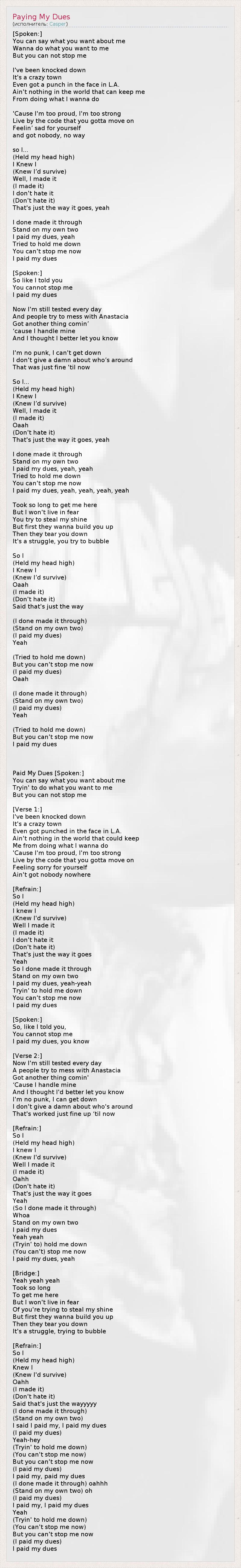 [Spoken:] You can say what you want about me Wanna do what you want to me But you can not stop me I've been knocked down It's a crazy town Even got a punch in the face in L.A. Ain't nothing in the world that can keep me From doing what I wanna do 'Cause I'm too proud, I'm too strong Live by the code that you gotta move on Feelin’ sad for yourself and got nobody, no way so I... (Held my head high) I Knew I (Knew I’d survive) Well, I made it (I made it) I don't hate it (Don't hate it) That's just the way it goes, yeah I done made it through Stand on my own two I paid my dues, yeah Tried to hold me down You can't stop me now I paid my dues [Spoken:] So like I told you You cannot stop me I paid my dues Now I'm still tested every day And people try to mess with Anastacia Got another thing comin’ ‘cause I handle mine And I thought I better let you know I'm no punk, I can't get down I don't give a damn about who’s around That was just fine 'til now So I... (Held my head high) I Knew I (Knew I’d survive) Well, I made it (I made it) Oaah (Don't hate it) That's just the way it goes, yeah I done made it through Stand on my own two I paid my dues, yeah, yeah Tried to hold me down You can't stop me now I paid my dues, yeah, yeah, yeah, yeah Took so long to get me here But I won't live in fear You try to steal my shine But first they wanna build you up Then they tear you down It's a struggle, you try to bubble So I (Held my head high) I Knew I (Knew I’d survive) Oaah (I made it) (Don't hate it) Said that's just the way (I done made it through) (Stand on my own two) (I paid my dues) Yeah (Tried to hold me down) But you can't stop me now (I paid my dues) Oaah (I done made it through) (Stand on my own two) (I paid my dues) Yeah (Tried to hold me down) But you can't stop me now I paid my dues Paid My Dues [Spoken:] You can say what you want about me Tryin' to do what you want to me But you can not stop me [Verse 1:] I've been knocked down It's a crazy town Even got punched in the face in L.A. Ain't nothing in the world that could keep Me from doing what I wanna do 'Cause I'm too proud, I'm too strong Live by the code that you gotta move on Feeling sorry for yourself Ain't got nobody nowhere [Refrain:] So I (Held my head high) I knew I (Knew I'd survive) Well I made it (I made it) I don't hate it (Don't hate it) That's just the way it goes Yeah So I done made it through Stand on my own two I paid my dues, yeah-yeah Tryin' to hold me down You can't stop me now I paid my dues [Spoken:] So, like I told you, You cannot stop me I paid my dues, you know [Verse 2:] Now I'm still tested every day A people try to mess with Anastacia Got another thing comin' ‘Cause I handle mine And I thought I'd better let you know I'm no punk, I can get down I don't give a damn about who's around That's worked just fine up ‘til now [Refrain:] So I (Held my head high) I knew I (Knew I'd survive) Well I made it (I made it) Oahh (Don't hate it) That's just the way it goes Yeah (So I done made it through) Whoa Stand on my own two I paid my dues Yeah yeah (Tryin' to) hold me down (You can't) stop me now I paid my dues, yeah [Bridge:] Yeah yeah yeah Took so long To get me here But I won't live in fear Of you're trying to steal my shine But first they wanna build you up Then they tear you down It's a struggle, trying to bubble [Refrain:] So I (Held my head high) Knew I (Knew I'd survive) Oahh (I made it) (Don't hate it) Said that's just the wayyyyy (I done made it through) (Stand on my own two) I said I paid my, I paid my dues (I paid my dues) Yeah-hey (Tryin' to hold me down) (You can't stop me now) But you can't stop me now (I paid my dues) I paid my, paid my dues (I done made it through) oahhh (Stand on my own two) oh (I paid my dues) I paid my, I paid my dues Yeah (Tryin' to hold me down) (You can't stop me now) But you can't stop me now (I paid my dues) I paid my dues