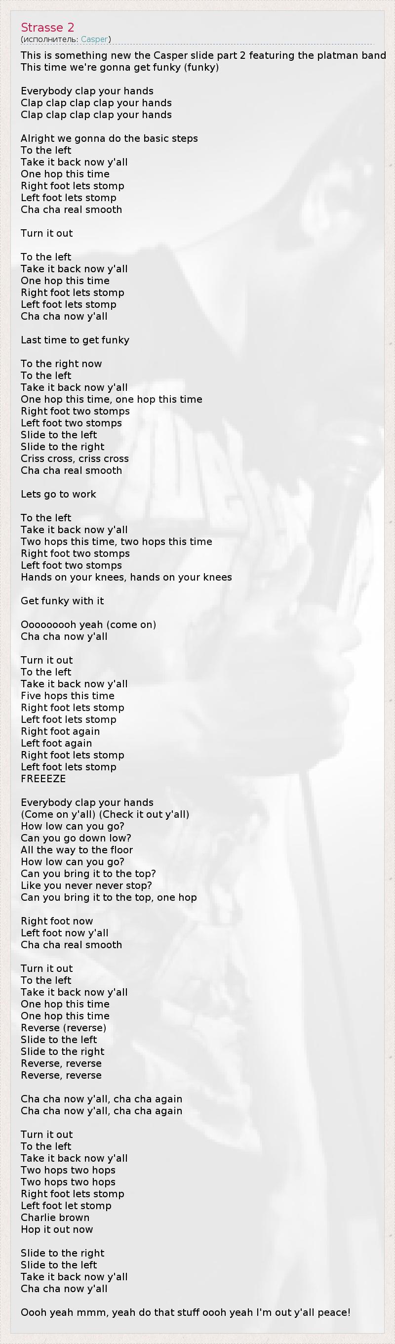 This is something new the Casper slide part 2 featuring the platman band This time we're gonna get funky (funky) Everybody clap your hands Clap clap clap clap your hands Clap clap clap clap your hands Alright we gonna do the basic steps To the left Take it back now y'all One hop this time Right foot lets stomp Left foot lets stomp Cha cha real smooth Turn it out To the left Take it back now y'all One hop this time Right foot lets stomp Left foot lets stomp Cha cha now y'all Last time to get funky To the right now To the left Take it back now y'all One hop this time, one hop this time Right foot two stomps Left foot two stomps Slide to the left Slide to the right Criss cross, criss cross Cha cha real smooth Lets go to work To the left Take it back now y'all Two hops this time, two hops this time Right foot two stomps Left foot two stomps Hands on your knees, hands on your knees Get funky with it Ooooooooh yeah (come on) Cha cha now y'all Turn it out To the left Take it back now y'all Five hops this time Right foot lets stomp Left foot lets stomp Right foot again Left foot again Right foot lets stomp Left foot lets stomp FREEEZE Everybody clap your hands (Come on y'all) (Check it out y'all) How low can you go? Can you go down low? All the way to the floor How low can you go? Can you bring it to the top? Like you never never stop? Can you bring it to the top, one hop Right foot now Left foot now y'all Cha cha real smooth Turn it out To the left Take it back now y'all One hop this time One hop this time Reverse (reverse) Slide to the left Slide to the right Reverse, reverse Reverse, reverse Cha cha now y'all, cha cha again Cha cha now y'all, cha cha again Turn it out To the left Take it back now y'all Two hops two hops Two hops two hops Right foot lets stomp Left foot let stomp Charlie brown Hop it out now Slide to the right Slide to the left Take it back now y'all Cha cha now y'all Oooh yeah mmm, yeah do that stuff oooh yeah I'm out y'all peace!