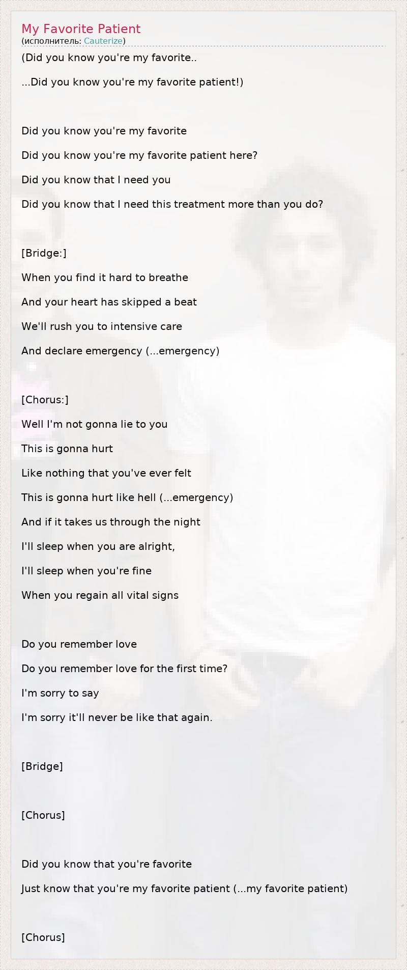 (Did you know you're my favorite.. ...Did you know you're my favorite patient!) Did you know you're my favorite Did you know you're my favorite patient here? Did you know that I need you Did you know that I need this treatment more than you do? [Bridge:] When you find it hard to breathe And your heart has skipped a beat We'll rush you to intensive care And declare emergency (...emergency) [Chorus:] Well I'm not gonna lie to you This is gonna hurt Like nothing that you've ever felt This is gonna hurt like hell (...emergency) And if it takes us through the night I'll sleep when you are alright, I'll sleep when you're fine When you regain all vital signs Do you remember love Do you remember love for the first time? I'm sorry to say I'm sorry it'll never be like that again. [Bridge] [Chorus] Did you know that you're favorite Just know that you're my favorite patient (...my favorite patient) [Chorus]