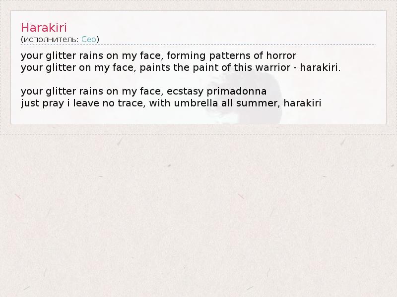 your glitter rains on my face, forming patterns of horror your glitter on my face, paints the paint of this warrior - harakiri. your glitter rains on my face, ecstasy primadonna just pray i leave no trace, with umbrella all summer, harakiri