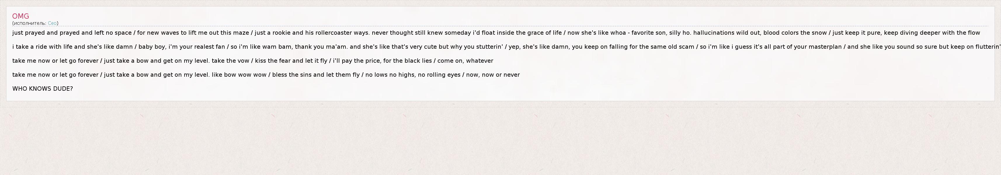 just prayed and prayed and left no space / for new waves to lift me out this maze / just a rookie and his rollercoaster ways. never thought still knew someday i'd float inside the grace of life / now she's like whoa - favorite son, silly ho. hallucinations wild out, blood colors the snow / just keep it pure, keep diving deeper with the flow i take a ride with life and she's like damn / baby boy, i'm your realest fan / so i'm like wam bam, thank you ma'am. and she's like that's very cute but why you stutterin' / yep, she's like damn, you keep on falling for the same old scam / so i'm like i guess it's all part of your masterplan / and she like you sound so sure but keep on flutterin' take me now or let go forever / just take a bow and get on my level. take the vow / kiss the fear and let it fly / i'll pay the price, for the black lies / come on, whatever take me now or let go forever / just take a bow and get on my level. like bow wow wow / bless the sins and let them fly / no lows no highs, no rolling eyes / now, now or never WHO KNOWS DUDE?