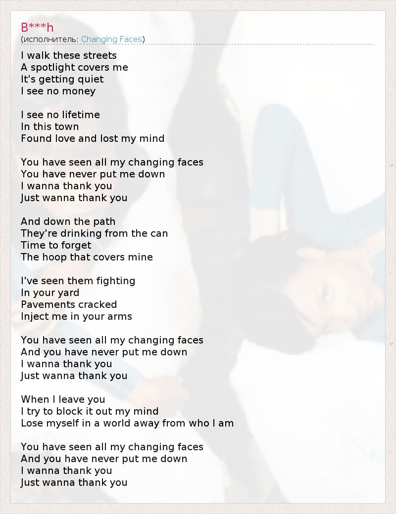 Я иду по этим улицам, Лучи фар скользят по мне, Наступает тишина, Я не вижу, где текут деньги. Я не вижу движения, В этом городе Я обрела любовь и потеряла голову. Ты видел все мои лица, Ты никогда не подводил меня, И я хочу сказать тебе спасибо, Просто сказать тебе спасибо. А дальше по дороге Кто-то пьёт из консервной банки, Пора отбросить Оковы, которые держат меня. Я видела драку В твоём дворе, Тротуары потрескались, Заключи меня в свои объятия. Ты видел все мои лица, Ты никогда не подводил меня, И я хочу сказать тебе спасибо, Просто сказать тебе спасибо. Уходя от тебя, Я стараюсь отбросить мысль об этом И поскорее забыться в суете жизни. Ты видел все мои лица, Ты никогда не подводил меня, И я хочу сказать тебе спасибо, Просто сказать тебе спасибо.