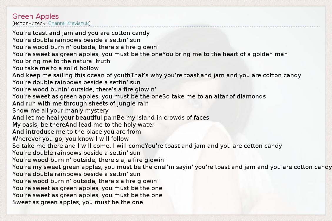You're toast and jam and you are cotton candy You're double rainbows beside a settin' sun You're wood burnin' outside, there's a fire glowin' You're sweet as green apples, you must be the oneYou bring me to the heart of a golden man You bring me to the natural truth You take me to a solid hollow And keep me sailing this ocean of youthThat's why you're toast and jam and you are cotton candy You're double rainbows beside a settin' sun You're wood bunin' outside, there's a fire glowin' You're sweet as green apples, you must be the oneSo take me to an altar of diamonds And run with me through sheets of jungle rain Show me all your manly mystery And let me heal your beautiful painBe my island in crowds of faces My oasis, be thereAnd lead me to the holy water And introduce me to the place you are from Wherever you go, you know I will follow So take me there and I will come, I will comeYou're toast and jam and you are cotton candy You're double rainbows beside a settin' sun You're wood burnin' outside, there's a, a fire glowin' You're my sweet green apples, you must be the oneI'm sayin' you're toast and jam and you are cotton candy You're double rainbows beside a settin' sun You're wood burnin' outside, there's a fire glowin' You're sweet as green apples, you must be the one You're sweet as green apples, you must be the one Sweet as green apples, you must be the one