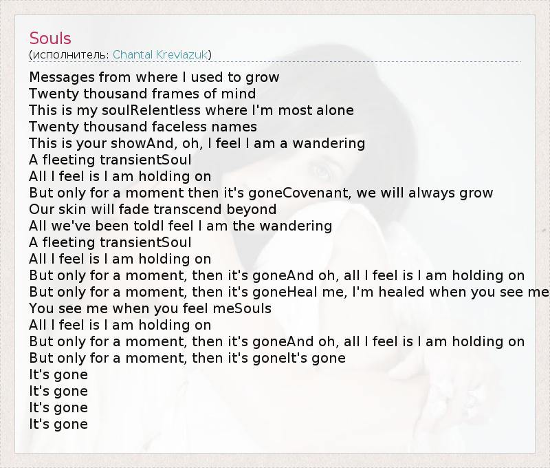 Messages from where I used to grow Twenty thousand frames of mind This is my soulRelentless where I'm most alone Twenty thousand faceless names This is your showAnd, oh, I feel I am a wandering A fleeting transientSoul All I feel is I am holding on But only for a moment then it's goneCovenant, we will always grow Our skin will fade transcend beyond All we've been toldI feel I am the wandering A fleeting transientSoul All I feel is I am holding on But only for a moment, then it's goneAnd oh, all I feel is I am holding on But only for a moment, then it's goneHeal me, I'm healed when you see me You see me when you feel meSouls All I feel is I am holding on But only for a moment, then it's goneAnd oh, all I feel is I am holding on But only for a moment, then it's goneIt's gone It's gone It's gone It's gone It's gone