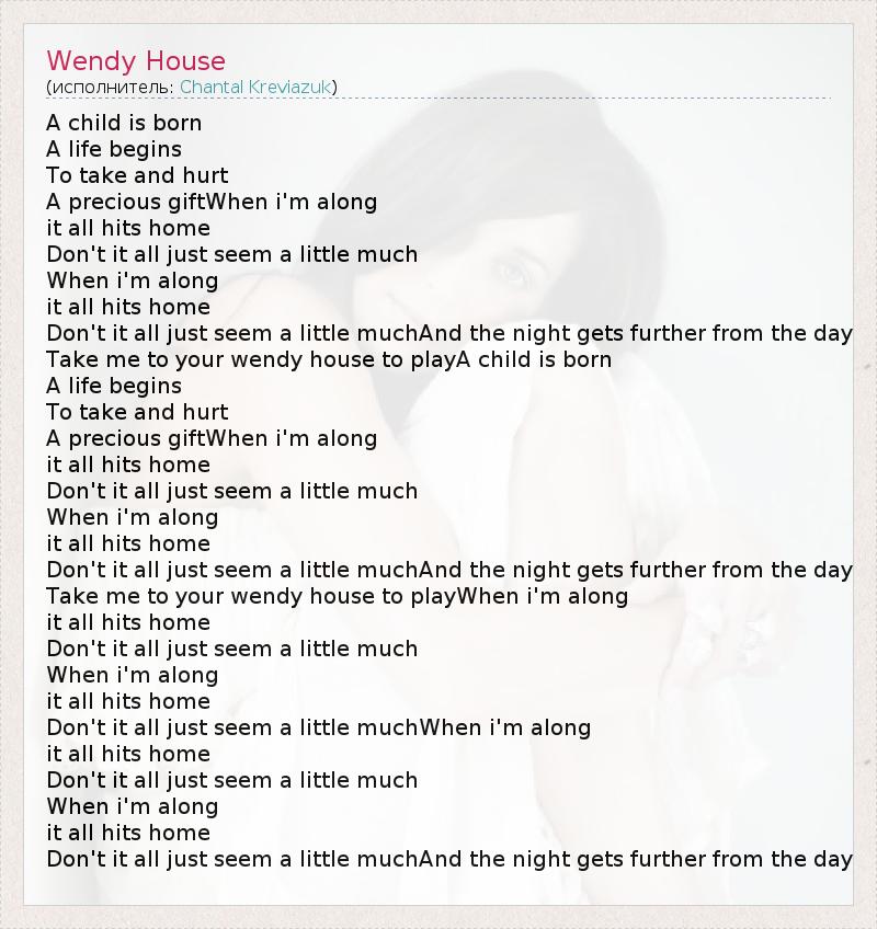 A child is born A life begins To take and hurt A precious giftWhen i'm along it all hits home Don't it all just seem a little much When i'm along it all hits home Don't it all just seem a little muchAnd the night gets further from the day Take me to your wendy house to playA child is born A life begins To take and hurt A precious giftWhen i'm along it all hits home Don't it all just seem a little much When i'm along it all hits home Don't it all just seem a little muchAnd the night gets further from the day Take me to your wendy house to playWhen i'm along it all hits home Don't it all just seem a little much When i'm along it all hits home Don't it all just seem a little muchWhen i'm along it all hits home Don't it all just seem a little much When i'm along it all hits home Don't it all just seem a little muchAnd the night gets further from the day