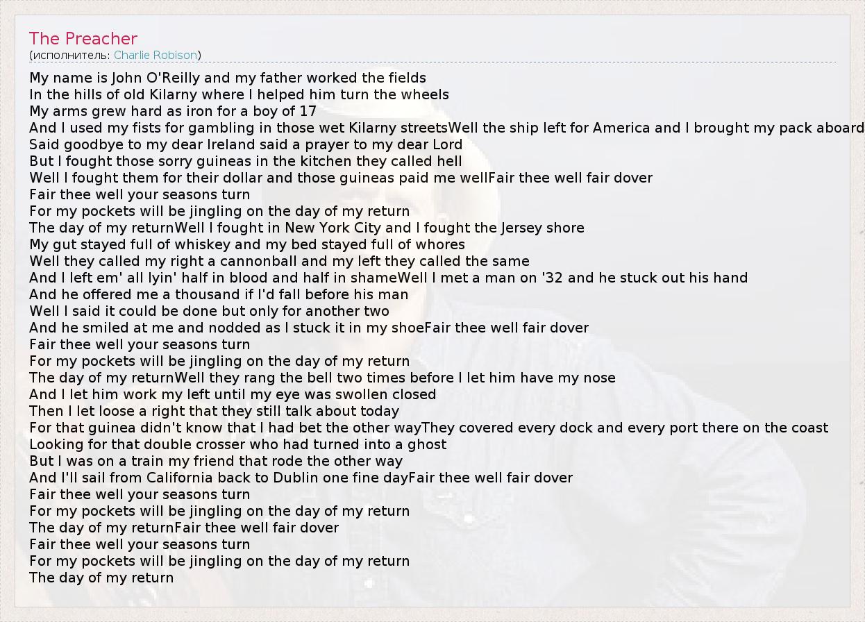And I used my fists for gambling in those wet Kilarny streetsWell the ship left for America and I brought my pack aboard