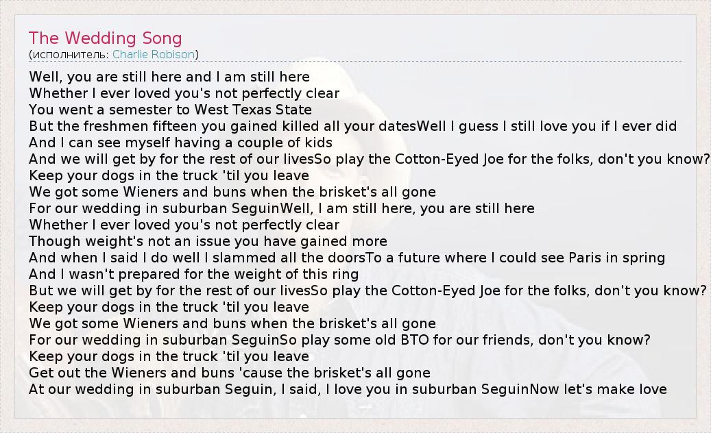 Well, you are still here and I am still here Whether I ever loved you's not perfectly clear You went a semester to West Texas State But the freshmen fifteen you gained killed all your datesWell I guess I still love you if I ever did And I can see myself having a couple of kids And we will get by for the rest of our livesSo play the Cotton-Eyed Joe for the folks, don't you know? Keep your dogs in the truck 'til you leave We got some Wieners and buns when the brisket's all gone For our wedding in suburban SeguinWell, I am still here, you are still here Whether I ever loved you's not perfectly clear Though weight's not an issue you have gained more And when I said I do well I slammed all the doorsTo a future where I could see Paris in spring And I wasn't prepared for the weight of this ring But we will get by for the rest of our livesSo play the Cotton-Eyed Joe for the folks, don't you know? Keep your dogs in the truck 'til you leave We got some Wieners and buns when the brisket's all gone For our wedding in suburban SeguinSo play some old BTO for our friends, don't you know? Keep your dogs in the truck 'til you leave Get out the Wieners and buns 'cause the brisket's all gone At our wedding in suburban Seguin, I said, I love you in suburban SeguinNow let's make love