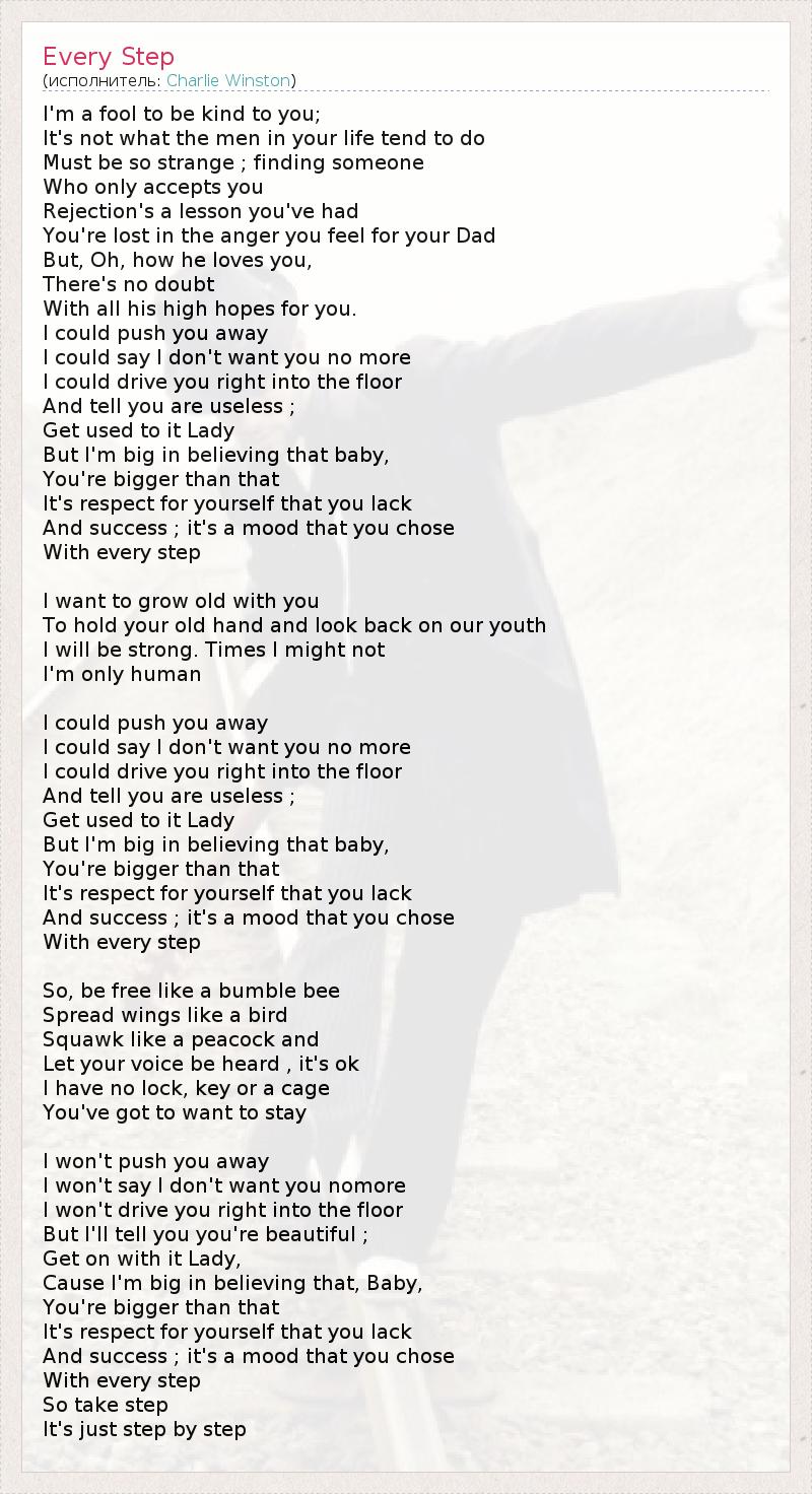 I'm a fool to be kind to you; It's not what the men in your life tend to do Must be so strange ; finding someone Who only accepts you Rejection's a lesson you've had You're lost in the anger you feel for your Dad But, Oh, how he loves you, There's no doubt With all his high hopes for you. I could push you away I could say I don't want you no more I could drive you right into the floor And tell you are useless ; Get used to it Lady But I'm big in believing that baby, You're bigger than that It's respect for yourself that you lack And success ; it's a mood that you chose With every step I want to grow old with you To hold your old hand and look back on our youth I will be strong. Times I might not I'm only human I could push you away I could say I don't want you no more I could drive you right into the floor And tell you are useless ; Get used to it Lady But I'm big in believing that baby, You're bigger than that It's respect for yourself that you lack And success ; it's a mood that you chose With every step So, be free like a bumble bee Spread wings like a bird Squawk like a peacock and Let your voice be heard , it's ok I have no lock, key or a cage You've got to want to stay I won't push you away I won't say I don't want you nomore I won't drive you right into the floor But I'll tell you you're beautiful ; Get on with it Lady, Cause I'm big in believing that, Baby, You're bigger than that It's respect for yourself that you lack And success ; it's a mood that you chose With every step So take step It's just step by step