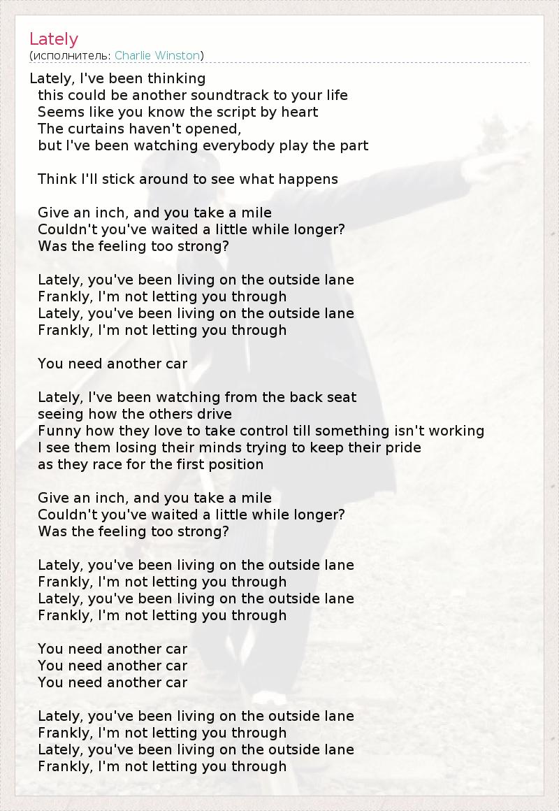 Lately, I've been thinking this could be another soundtrack to your life Seems like you know the script by heart The curtains haven't opened, but I've been watching everybody play the part Think I'll stick around to see what happens Give an inch, and you take a mile Couldn't you've waited a little while longer? Was the feeling too strong? Lately, you've been living on the outside lane Frankly, I'm not letting you through Lately, you've been living on the outside lane Frankly, I'm not letting you through You need another car Lately, I've been watching from the back seat seeing how the others drive Funny how they love to take control till something isn't working I see them losing their minds trying to keep their pride as they race for the first position Give an inch, and you take a mile Couldn't you've waited a little while longer? Was the feeling too strong? Lately, you've been living on the outside lane Frankly, I'm not letting you through Lately, you've been living on the outside lane Frankly, I'm not letting you through You need another car You need another car You need another car Lately, you've been living on the outside lane Frankly, I'm not letting you through Lately, you've been living on the outside lane Frankly, I'm not letting you through