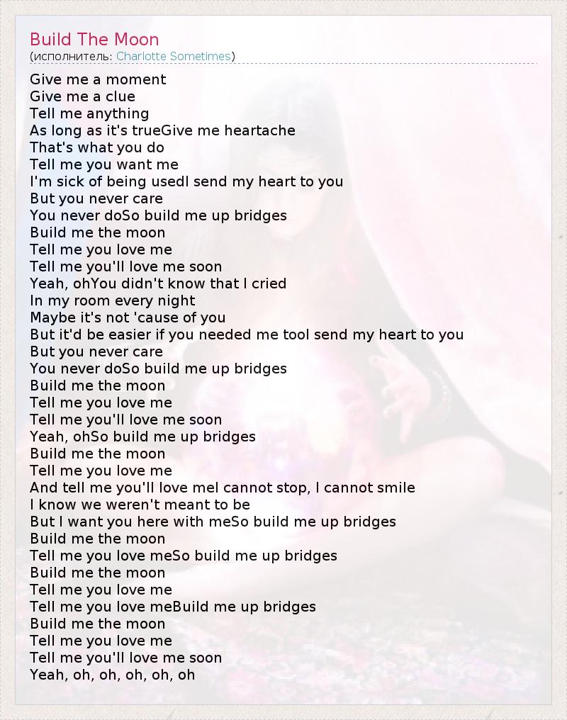 Give me a moment Give me a clue Tell me anything As long as it's trueGive me heartache That's what you do Tell me you want me I'm sick of being usedI send my heart to you But you never care You never doSo build me up bridges Build me the moon Tell me you love me Tell me you'll love me soon Yeah, ohYou didn't know that I cried In my room every night Maybe it's not 'cause of you But it'd be easier if you needed me tooI send my heart to you But you never care You never doSo build me up bridges Build me the moon Tell me you love me Tell me you'll love me soon Yeah, ohSo build me up bridges Build me the moon Tell me you love me And tell me you'll love meI cannot stop, I cannot smile I know we weren't meant to be But I want you here with meSo build me up bridges Build me the moon Tell me you love meSo build me up bridges Build me the moon Tell me you love me Tell me you love meBuild me up bridges Build me the moon Tell me you love me Tell me you'll love me soon Yeah, oh, oh, oh, oh, oh