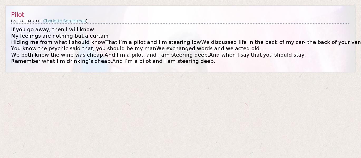 If you go away, then I will know My feelings are nothing but a curtain Hiding me from what I should knowThat I'm a pilot and I'm steering lowWe discussed life in the back of my car- the back of your van You know the psychic said that, you should be my manWe exchanged words and we acted old... We both knew the wine was cheap.And I'm a pilot, and I am steering deep.And when I say that you should stay. Remember what I'm drinking's cheap.And I'm a pilot and I am steering deep.