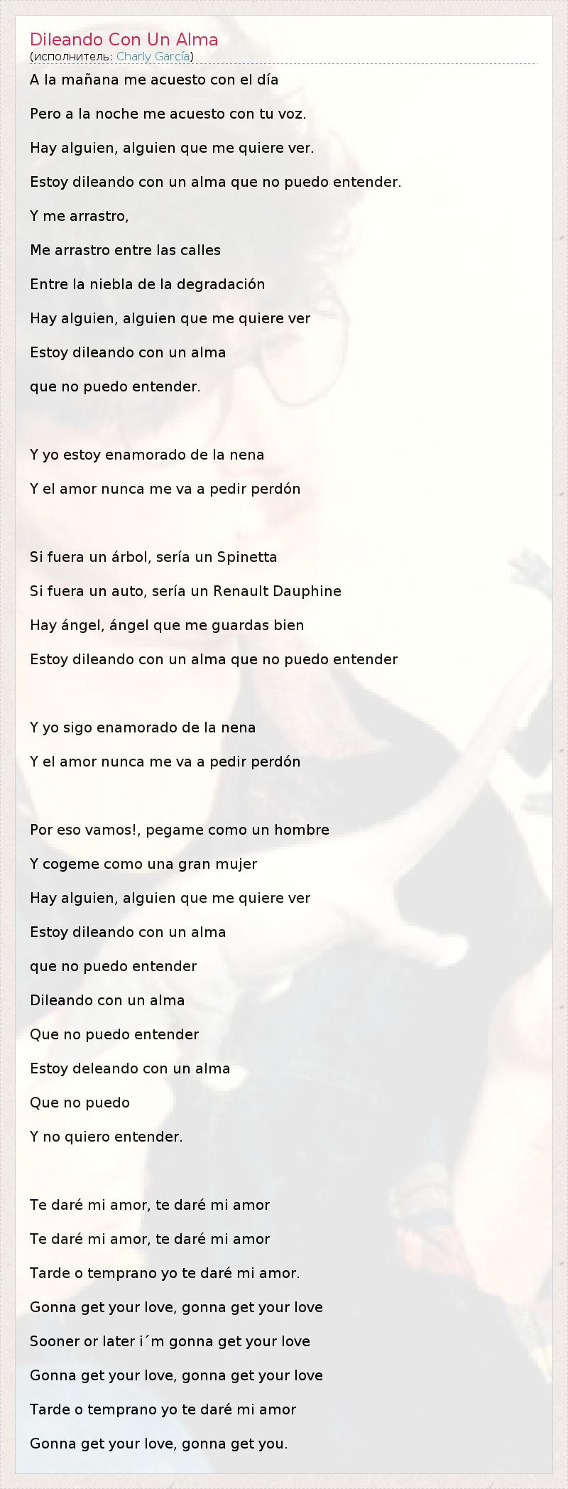 A la mañana me acuesto con el día Pero a la noche me acuesto con tu voz. Hay alguien, alguien que me quiere ver. Estoy dileando con un alma que no puedo entender. Y me arrastro, Me arrastro entre las calles Entre la niebla de la degradación Hay alguien, alguien que me quiere ver Estoy dileando con un alma que no puedo entender. Y yo estoy enamorado de la nena Y el amor nunca me va a pedir perdón Si fuera un árbol, sería un Spinetta Si fuera un auto, sería un Renault Dauphine Hay ángel, ángel que me guardas bien Estoy dileando con un alma que no puedo entender Y yo sigo enamorado de la nena Y el amor nunca me va a pedir perdón Por eso vamos!, pegame como un hombre Y cogeme como una gran mujer Hay alguien, alguien que me quiere ver Estoy dileando con un alma que no puedo entender Dileando con un alma Que no puedo entender Estoy deleando con un alma Que no puedo Y no quiero entender. Te daré mi amor, te daré mi amor Te daré mi amor, te daré mi amor Tarde o temprano yo te daré mi amor. Gonna get your love, gonna get your love Sooner or later i´m gonna get your love Gonna get your love, gonna get your love Tarde o temprano yo te daré mi amor Gonna get your love, gonna get you.