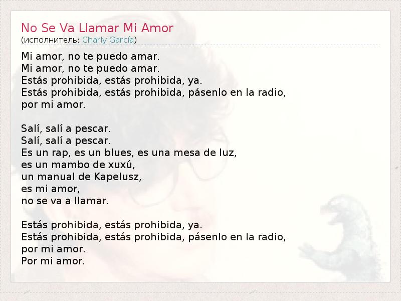 Mi amor, no te puedo amar. Mi amor, no te puedo amar. Estás prohibida, estás prohibida, ya. Estás prohibida, estás prohibida, pásenlo en la radio, por mi amor. Salí, salí a pescar. Salí, salí a pescar. Es un rap, es un blues, es una mesa de luz, es un mambo de xuxú, un manual de Kapelusz, es mi amor, no se va a llamar. Estás prohibida, estás prohibida, ya. Estás prohibida, estás prohibida, pásenlo en la radio, por mi amor. Por mi amor.