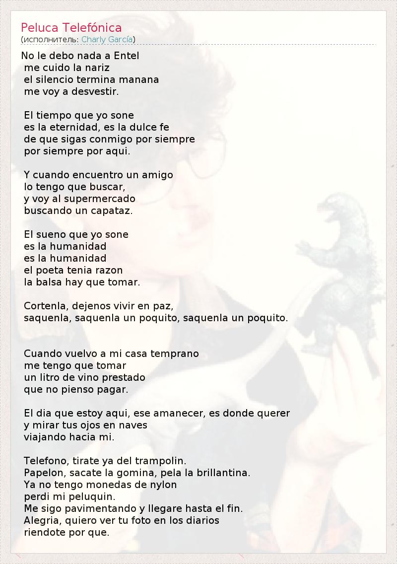 No le debo nada a Entel me cuido la nariz el silencio termina manana me voy a desvestir. El tiempo que yo sone es la eternidad, es la dulce fe de que sigas conmigo por siempre por siempre por aqui. Y cuando encuentro un amigo lo tengo que buscar, y voy al supermercado buscando un capataz. El sueno que yo sone es la humanidad es la humanidad el poeta tenia razon la balsa hay que tomar. Cortenla, dejenos vivir en paz, saquenla, saquenla un poquito, saquenla un poquito. Cuando vuelvo a mi casa temprano me tengo que tomar un litro de vino prestado que no pienso pagar. El dia que estoy aqui, ese amanecer, es donde querer y mirar tus ojos en naves viajando hacia mi. Telefono, tirate ya del trampolin. Papelon, sacate la gomina, pela la brillantina. Ya no tengo monedas de nylon perdi mi peluquin. Me sigo pavimentando y llegare hasta el fin. Alegria, quiero ver tu foto en los diarios riendote por que.