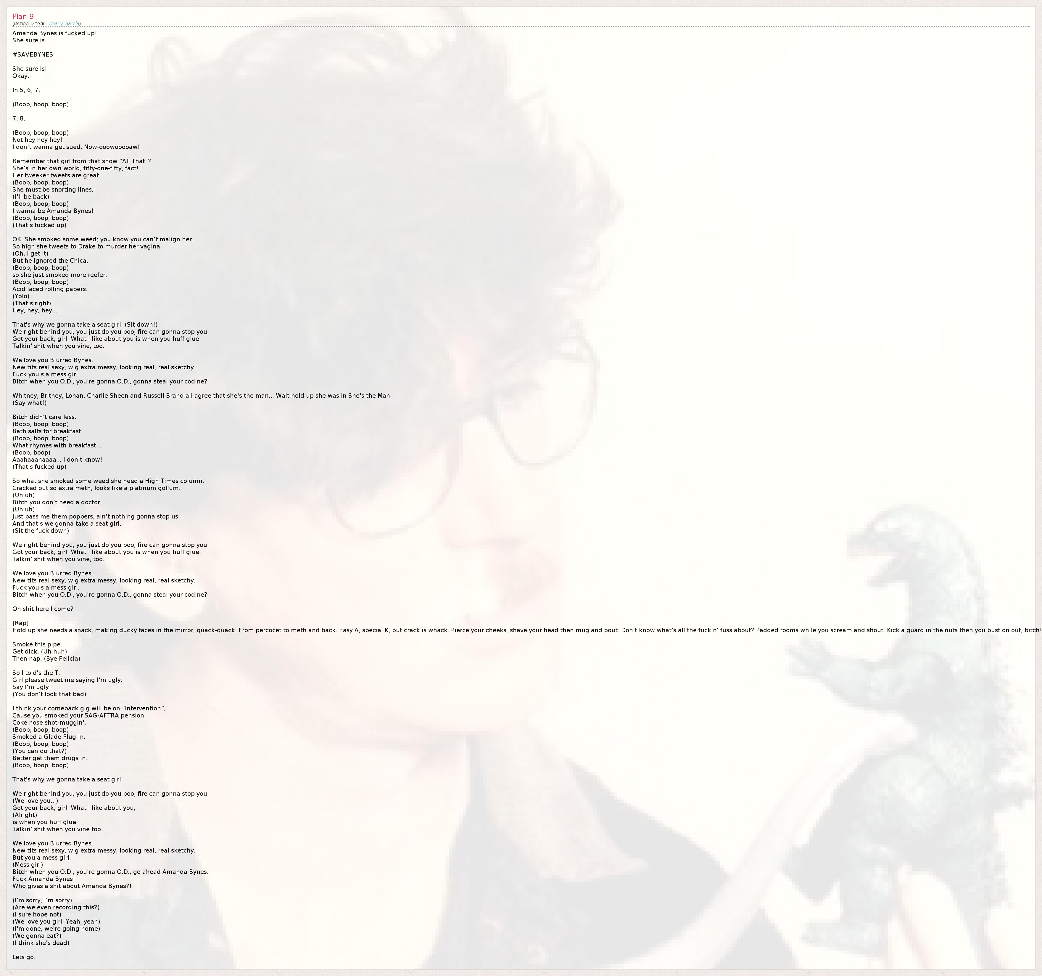 Аманда Байнс - облажалась! Совершенно точно. #СПАСЁМБАЙНС Да, облажалась! Ладно. На счет 5, 6, 7. (Буп, буп, буп) 7, 8... (Буп, буп, буп) Не надо мне тут! Я не хочу получить иск. Не-ееееет! Помните эту девушку, из шоу "Всякая Всячина"?[1] Там она шла под номером 5150, правда! Она, должно быть, нанюхалась. (Я скоро вернусь) (Буп, буп, буп) Хочу быть Амандой Байнс! (Буп, буп, буп) (Это пи*дец) Хорошо. Она курила травку; знаешь, это плохо отразилось на ней. Она, даже, твитнула Дрейку, чтобы он убил её вагину. (О, я понял) Но он проигнорировал чиксу, (Буп, буп, буп) ведь она дымила марихуаной, (Буп, буп, буп) Вдыхала кислоту из папиросной бумаги. (Да, ладно) (Это так) Эй, эй, эй... Вот почему мы собираемся занять её место. (Сидеть!) Мы дышим тебе в спину, ты сдулась, огонь не может остановить нас. Мы прикроем тебя, девочка. Что мне нравится в тебе, так это то, что ты дуешь[2]. И несёшь околесицу, будучи в угаре. Мы любим тебя, размытая Байнс. Новые сиськи хороши, только парик грязноват, выглядишь как, как пародия на саму себя. Пошла на х*й, грязная девка. Су*а, обратишься в полицию, если кто-то украдёт твои колёса? Уитни, Бритни, Лохан, Чарли Шин и Рассел Брэнд[3] солгасны с тем, что она мужчина. Стой, погоди, она снималась в фильме "Она - мужчина"[4]. (Да, ну!) Су*е уже по барабану. (Буп, буп, буп) Соль для ванны на завтрак. (Буп, буп, буп) Так, что там рифмуется со словом "завтрак"... (Буп, буп) А-ааа... Не знаю! (Облажалась) А ещё она курила травку, в небоскрёбе Хай Таймз, Догонялась метамфетамином[5], и выглядит как платиновый гоблин. (Да, да) Су*ка, обратись к врачу! (Да, да) Только дайте нам попперс[6], и ничто нас не остановит. И вот мы, наконец, займём её место. (Да усадите вы её) Мы дышим тебе в спину, ты сдулась, огонь не может остановить нас. Мы прикроем тебя, девочка. Что мне нравится в тебе, так это то, что ты дуешь[2]. И несёшь околесицу, будучи в угаре. Мы любим тебя, размытая Байнс. Новые сиськи хороши, только парик грязноват, выглядишь как, как пародия на саму себя. Пошла на х*й, грязная девка. Су*а, обратишься в полицию, если кто-то украдёт твои колёса? Вот, дерьмо, я тут пройду? [Рэп] Погодите, её надо покормить, ведь она такую уточку делает в зеркале, кря-кря. От Перкоцета[7] к метамфетамину, и назад. Легко, комбинируя, но башка всё равно трещит. Проколи щёки, побрейся налысо, затем возьми бульбулятор[8] и дунь. Не знаю, что ты паникуешь? Обитая комната[9], а ты орёшь и шумишь. Пни охранника по яйцам и сиськами его, су*а! Выкури ещё. Отсоси. (Ага) Потом вздремни. (Пока, Фелиция[10]) Я сказала это, имхо. Девочка, твитни мне, что я уродина. Скажи, я уродина! (Ты не так плохо выглядишь) Я думаю, твой концерт по случаю возвращения будет на "Интервенции"[11], Потому что ты скурила свои накопления на SAG-AFTRA[12], Коксом[13], по чуть-чуть, через нос, (Буп, буп, буп) Посредством Glade Plug-In[14]. (Буп, буп, буп) (Ты сделаешь это?) Так лучше принимать наркотики. (Буп, буп, буп) Вот почему, мы хотим занять её место. Мы дышим тебе в спину, ты сдулась, огонь не может остановить нас. (Мы тебя любим...) Мы прикроем тебя, девочка. Что мне нравится в тебе, (Ладно) так это то, что ты дуешь[2]. И несёшь околесицу, будучи в угаре. Мы любим тебя, размытая Байнс. Новые сиськи хороши, только парик грязноват, выглядишь как, как пародия на саму себя. Но ты - грязная девка. (Грязная девка) Су*а, обратишься в полицию, вперёд, Аманда Байнс! Грёбанная Аманда Байнс! Кто предложит какашки Аманде Байнс?! (Прости, прости) (М