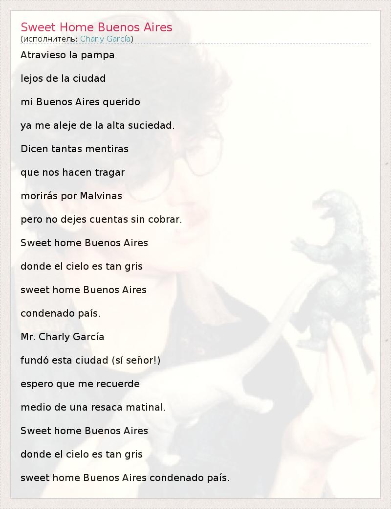 Atravieso la pampa lejos de la ciudad mi Buenos Aires querido ya me aleje de la alta suciedad. Dicen tantas mentiras que nos hacen tragar morirás por Malvinas pero no dejes cuentas sin cobrar. Sweet home Buenos Aires donde el cielo es tan gris sweet home Buenos Aires condenado país. Mr. Charly García fundó esta ciudad (sí señor!) espero que me recuerde medio de una resaca matinal. Sweet home Buenos Aires donde el cielo es tan gris sweet home Buenos Aires condenado país.